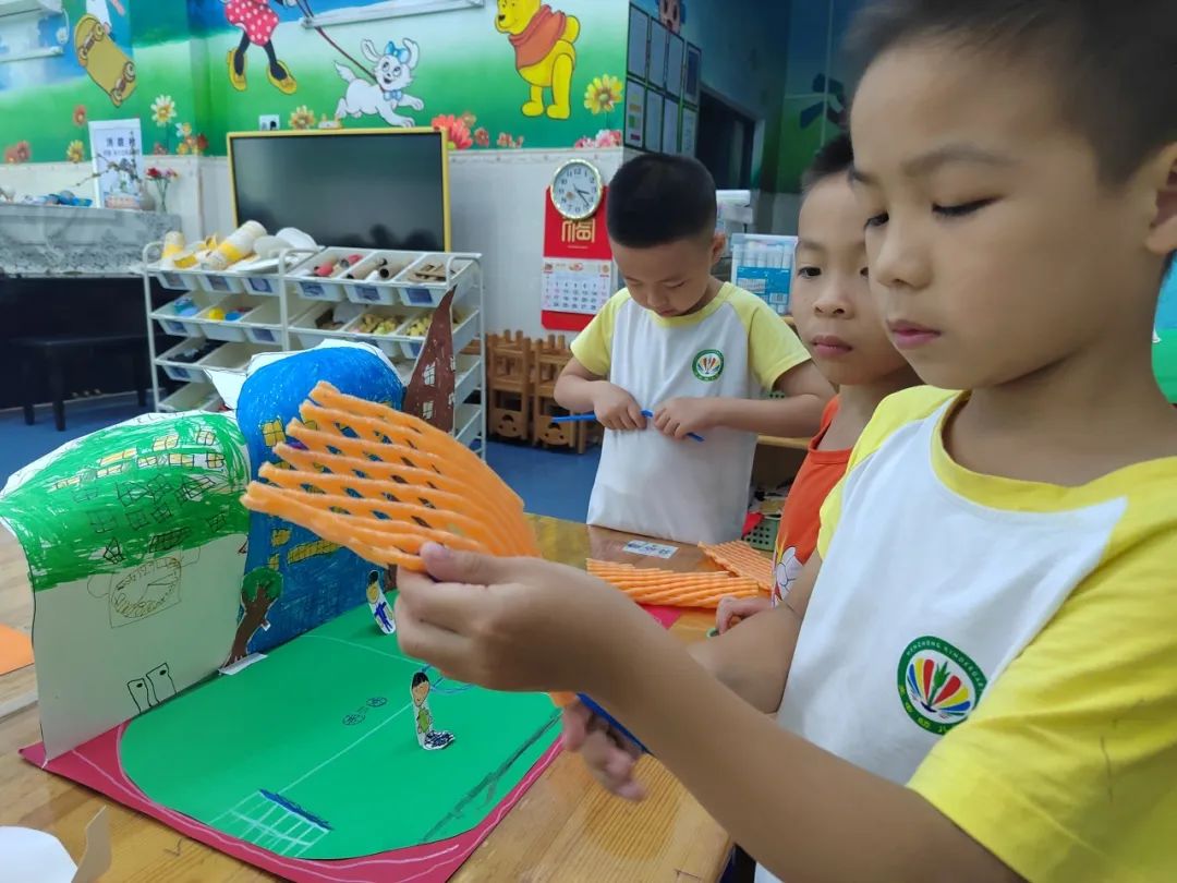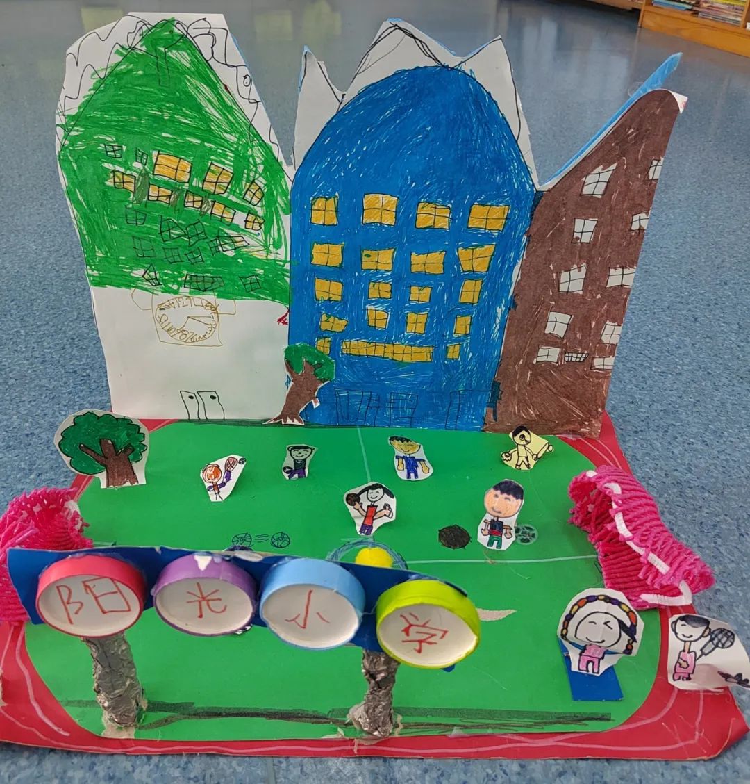 为令他们对小学生活感兴趣,我们一起制作设计了小学的操场的手工制作。