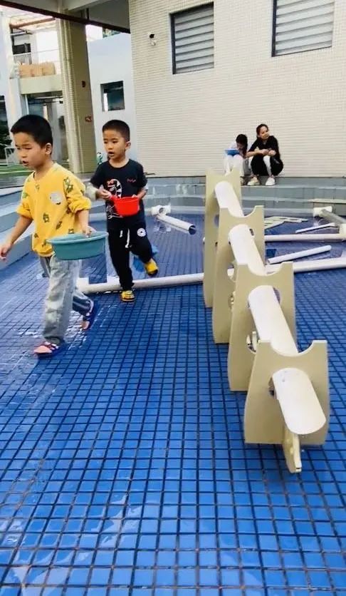 大小肌肉和精细动作:拎水、搭建管道滚球,往盆里倒水。