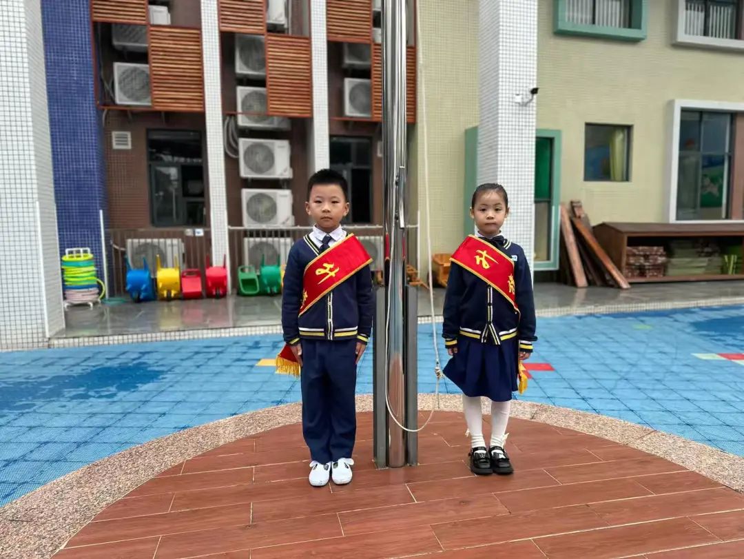 担任本周升旗手是来自大四班的陈羽翔小朋友和邓伊柔小朋友。