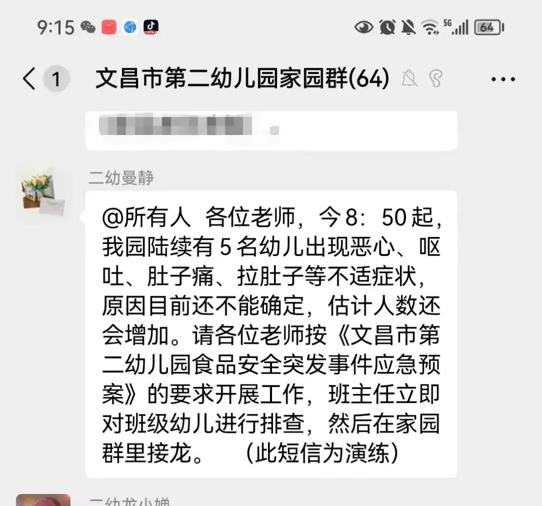 曾桂萍园长接到电话,第一时间让办公室主任广播告知全园各班级停止用餐,并启动《文昌市第二幼儿园食品安全突发应急处置预案》,要求各应急小组到达现场。同时,及时向上级主管部门汇报此次幼儿食品突发情况。