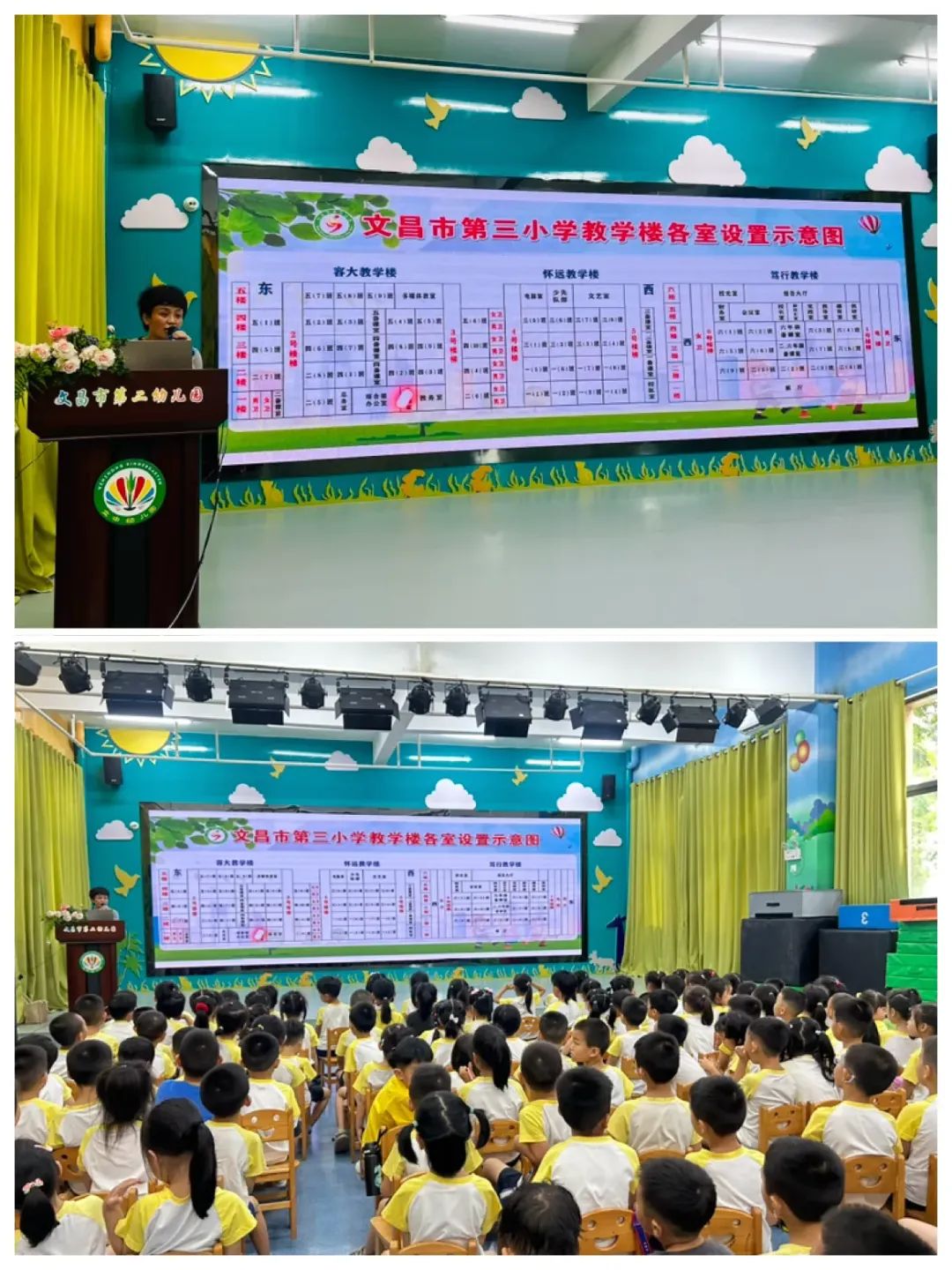 云老师带领孩子们认识教学楼分布图,介绍了一年级教室以及厕所位置。