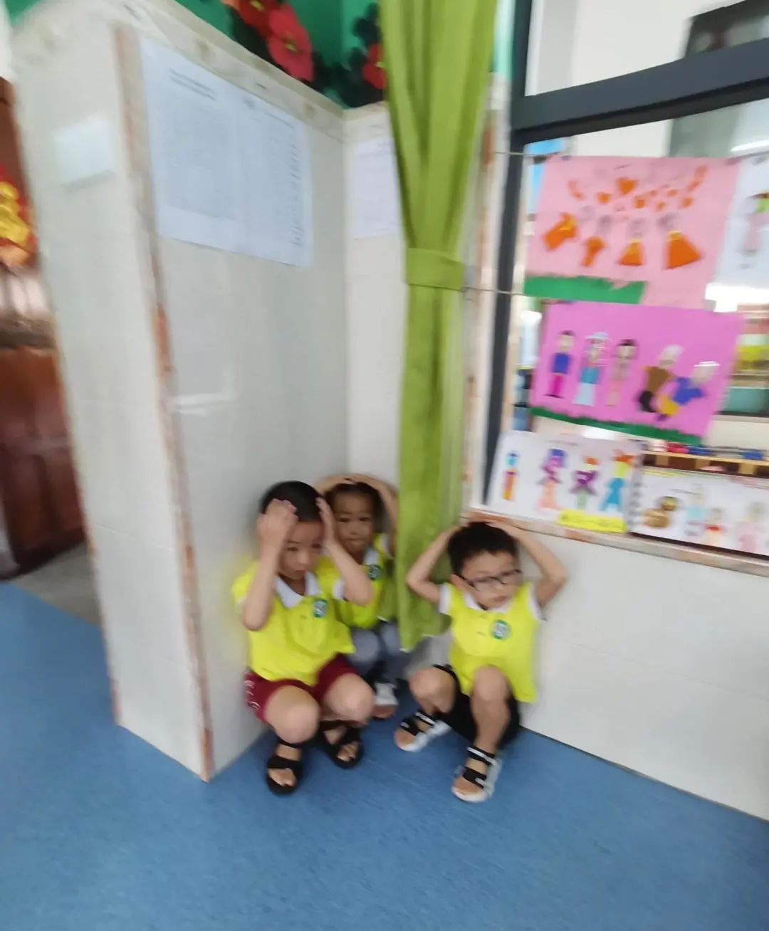 随着第一声警报声响起,防震疏散演练正式开始。各班老师立即告知幼儿“地震来了,不要慌”,并指挥幼儿紧急避险。在老师的指挥下,幼儿迅速寻找躲藏之处。