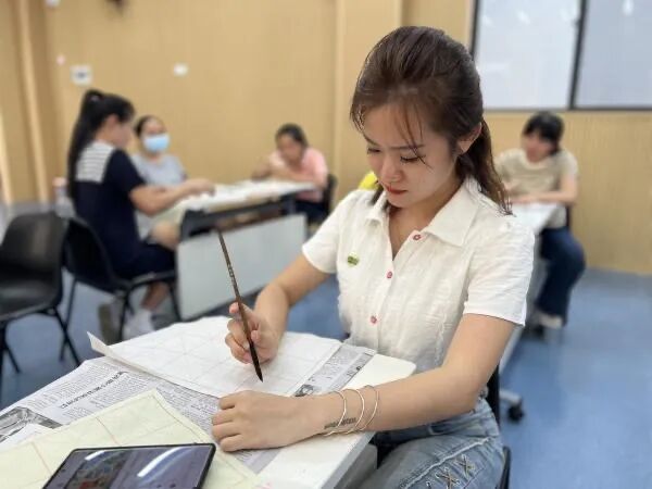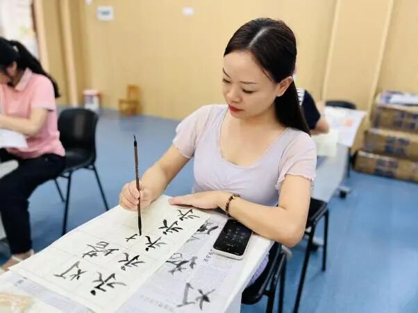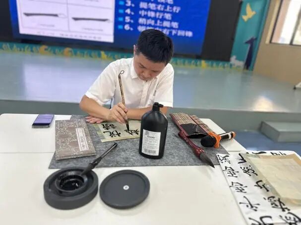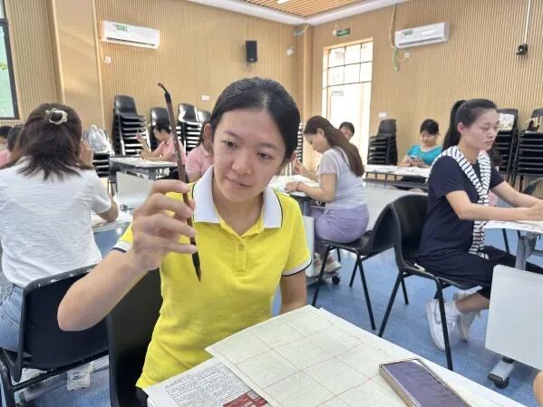 2025年9月15日,我园特邀擅长毛笔书法的大三班家长志愿者程韵凌爸爸进校园,为全体教师开展毛笔书法专项培训。活动中,家长志愿者从握笔姿势、运笔技巧、笔画结构等基础要点入手,通过示范讲解与一对一指导,帮助教师们感受毛笔书法的韵律与美感。教师们认真临摹练习,在笔墨互动间不仅提升了汉字书写规范意识,也进一步探索了“家校协同”传承文化、推广普通话的新路径,为后续教育教学中渗透语言文化教育积累了实践经验。