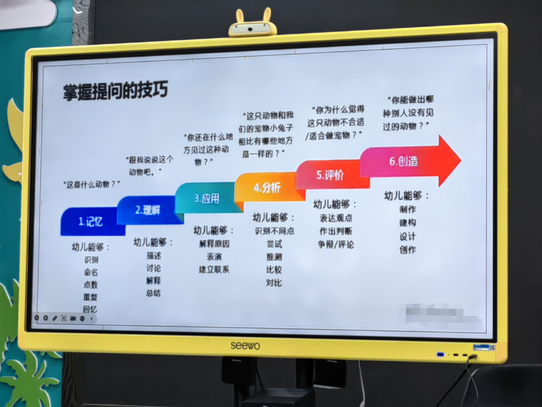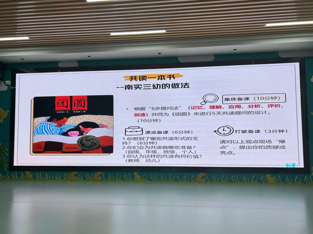 为贯彻落实教育部《幼儿园保育教育质量评估指南》精神,提高我园保教质量,促进教师专业化成长。2025年9月25日下午,在曾桂萍园长的带领下,我园开展了共读活动的“六步法”园本教研,通过“分享+研讨实操”,依托“六步提问法”推动教师掌握绘本阅读循序渐进的解读和指导方法。