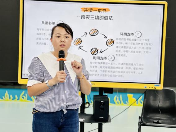 培训中,曾桂萍园长将上周参访贵阳南实三幼时,观摩到其园所有效开展共读活动的方式方法进行了二次分享,从而进一步拓展师幼共读活动中的实施策略,切实提升我园教师指导阅读活动实践活动的能力和水平。