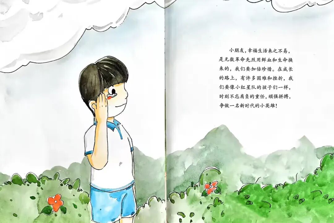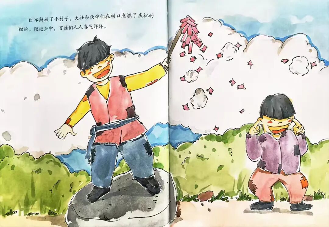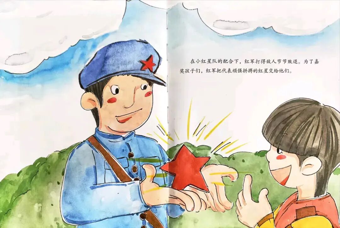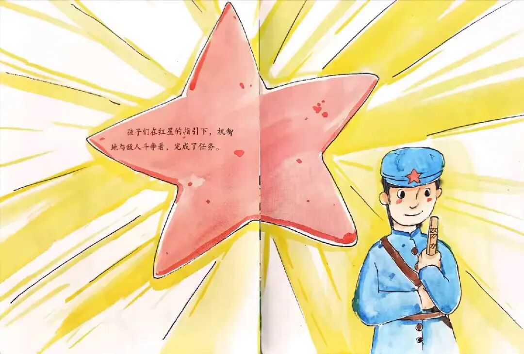 《红星闪闪放光彩》是一本中国原创绘本,以爱国主义题材,图画以大跨页为主,清新淡雅的背景搭配大面积留白,留下很多思考空间,伴随着故事情节的不断发展,大壮的成长与村庄环境的改变融合在一起,能让人感受到战争对人们的影响以及和平带来的巨大改变。画风淳朴,水彩创作,以红色、蓝色、绿色为主色调,呈现出一个红色主题教育的感人故事,水彩晕染效果突出,有深有浅,很有层次感。