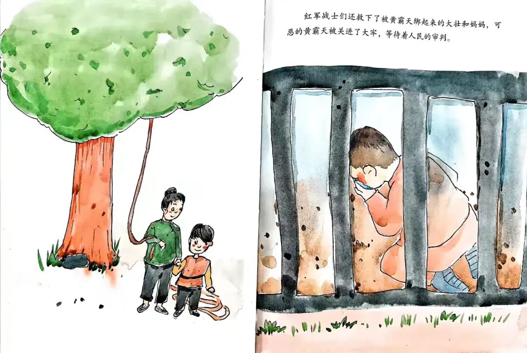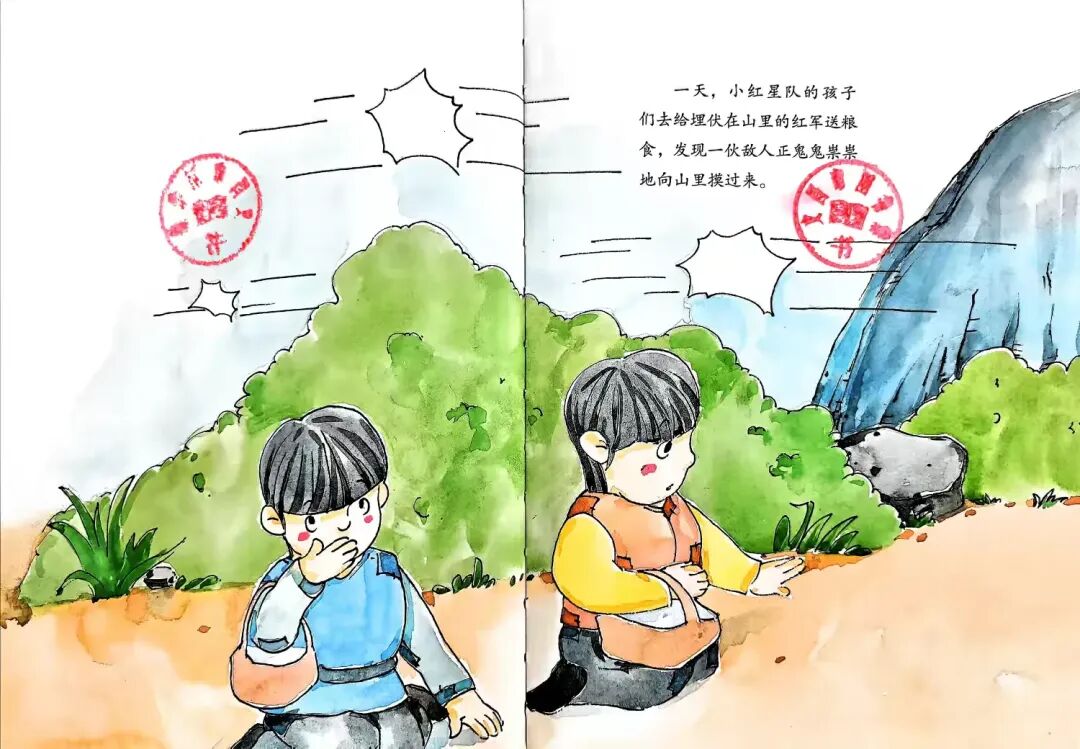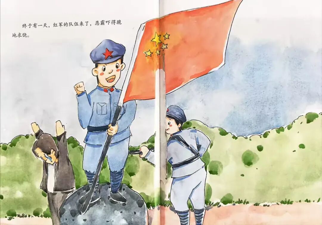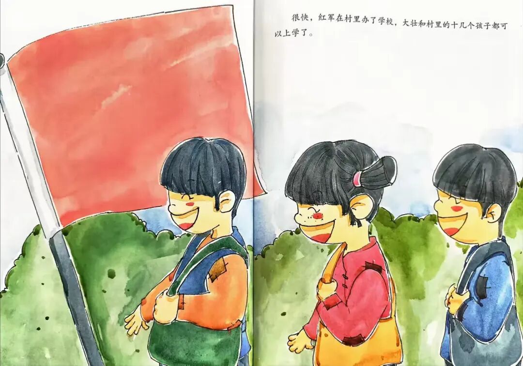 《红星闪闪放光彩》是一本中国原创绘本,以爱国主义题材,图画以大跨页为主,清新淡雅的背景搭配大面积留白,留下很多思考空间,伴随着故事情节的不断发展,大壮的成长与村庄环境的改变融合在一起,能让人感受到战争对人们的影响以及和平带来的巨大改变。画风淳朴,水彩创作,以红色、蓝色、绿色为主色调,呈现出一个红色主题教育的感人故事,水彩晕染效果突出,有深有浅,很有层次感。