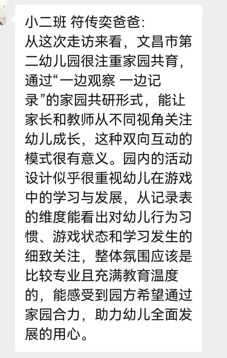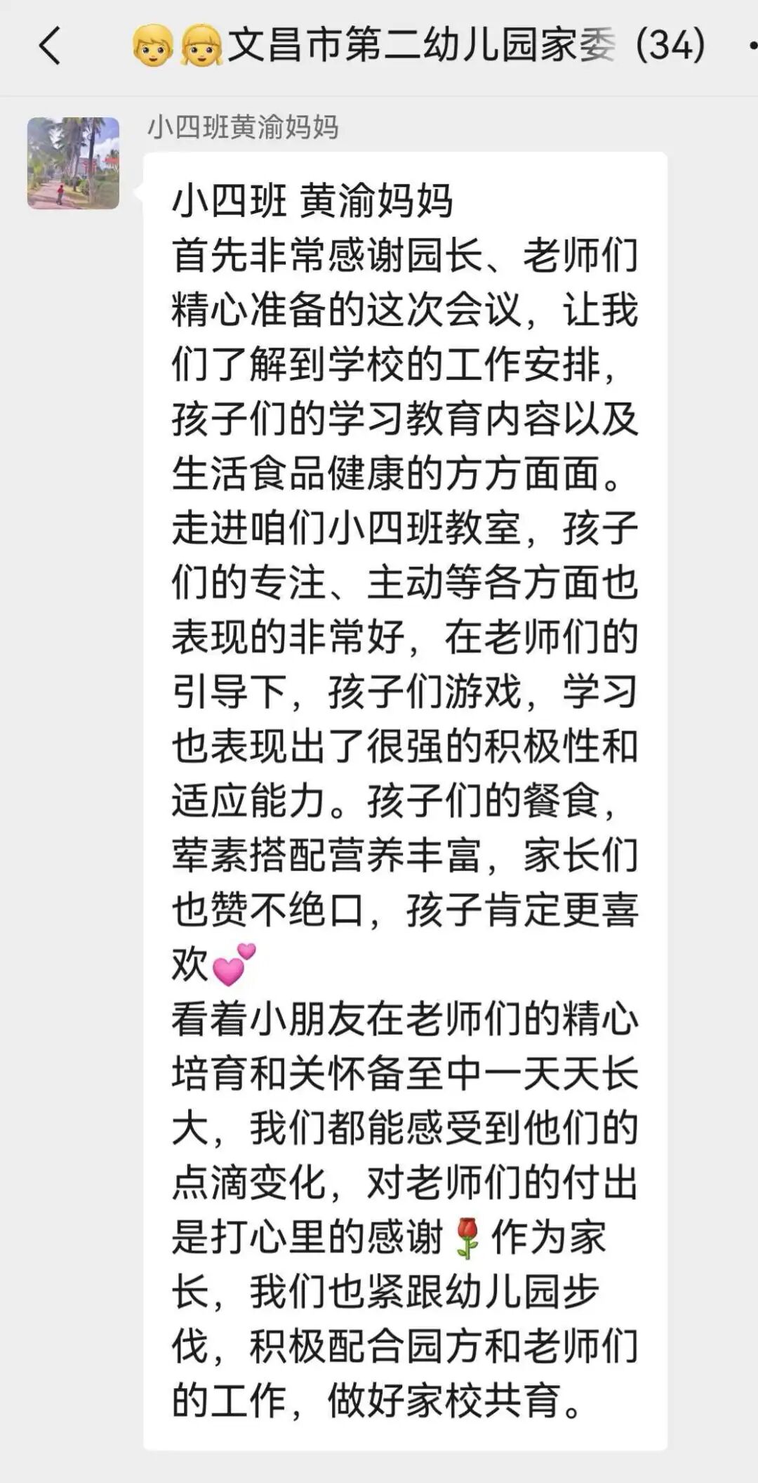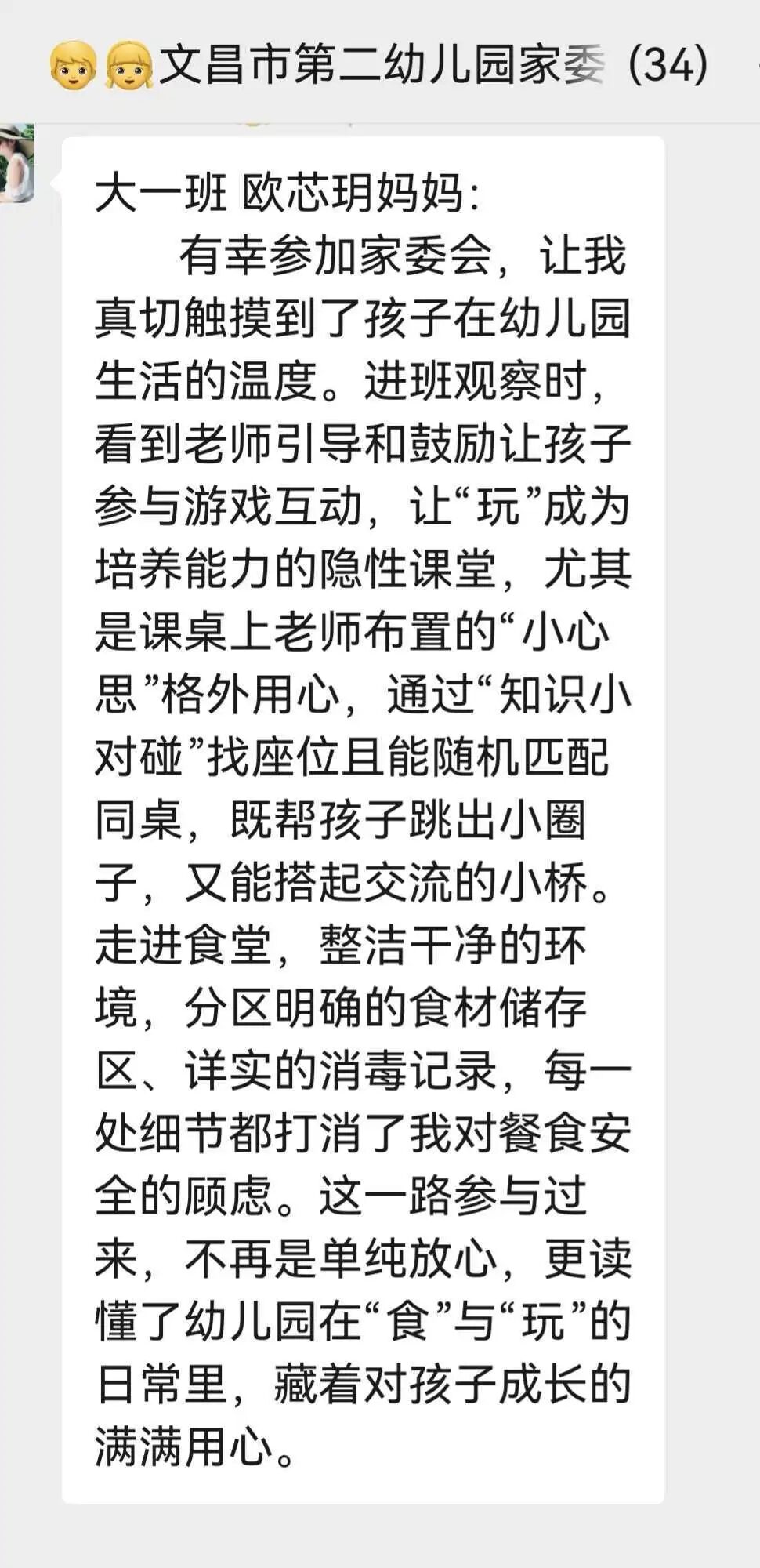会议结束后,家委们对本次会议发表了自己的感受,家委的肯定、支持是我们家园共育最大的动力。此次活动是家园携手的新起点,成功搭建起家园协同的坚实桥梁。文昌市第二幼儿园将持续推动家长深度参与园所建设,与家长共同为孩子们打造健康快乐的成长环境。