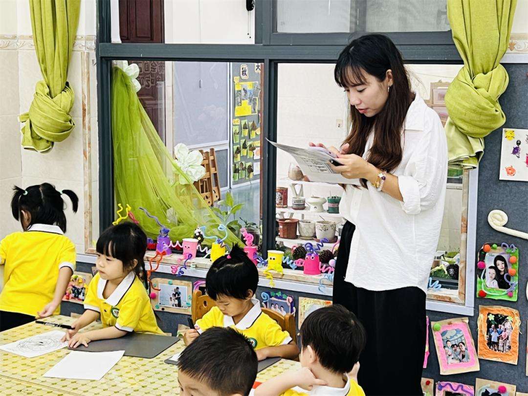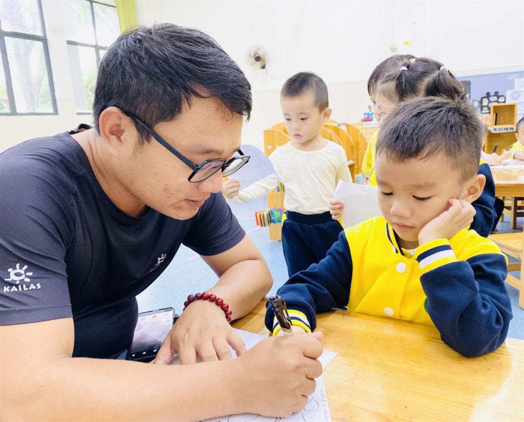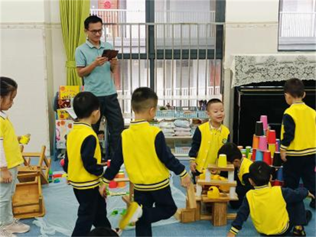 第二阶段聚焦“现场游戏观摩与共研”,由云永蕾副园长与教研主任共同负责,创新采用“沉浸式观察+专业化分析”模式:家委们深入班级,全程观摩幼儿游戏活动,关注游戏表征、倾听互动等关键环节。