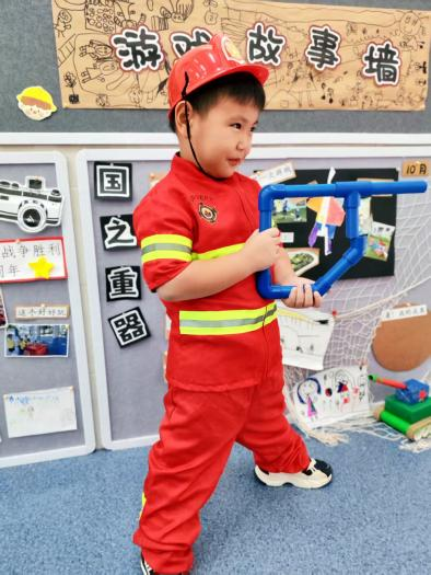 里仪说:我喜欢扮演消防员,他们的衣服是红色的,特别帅气!