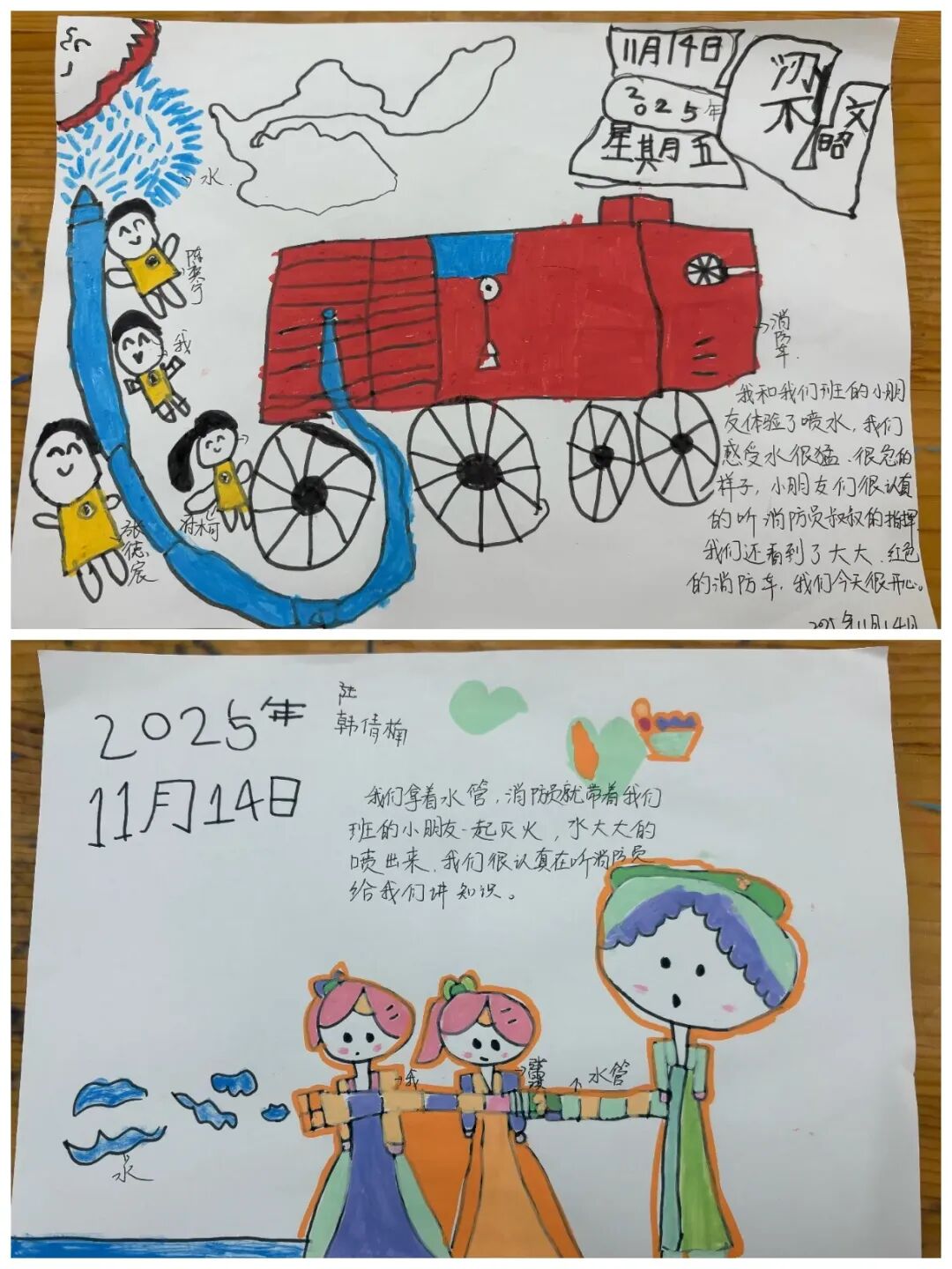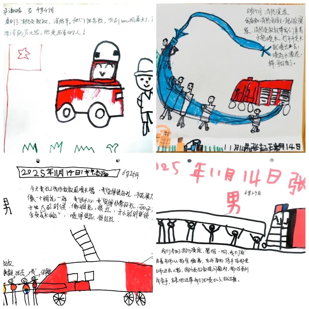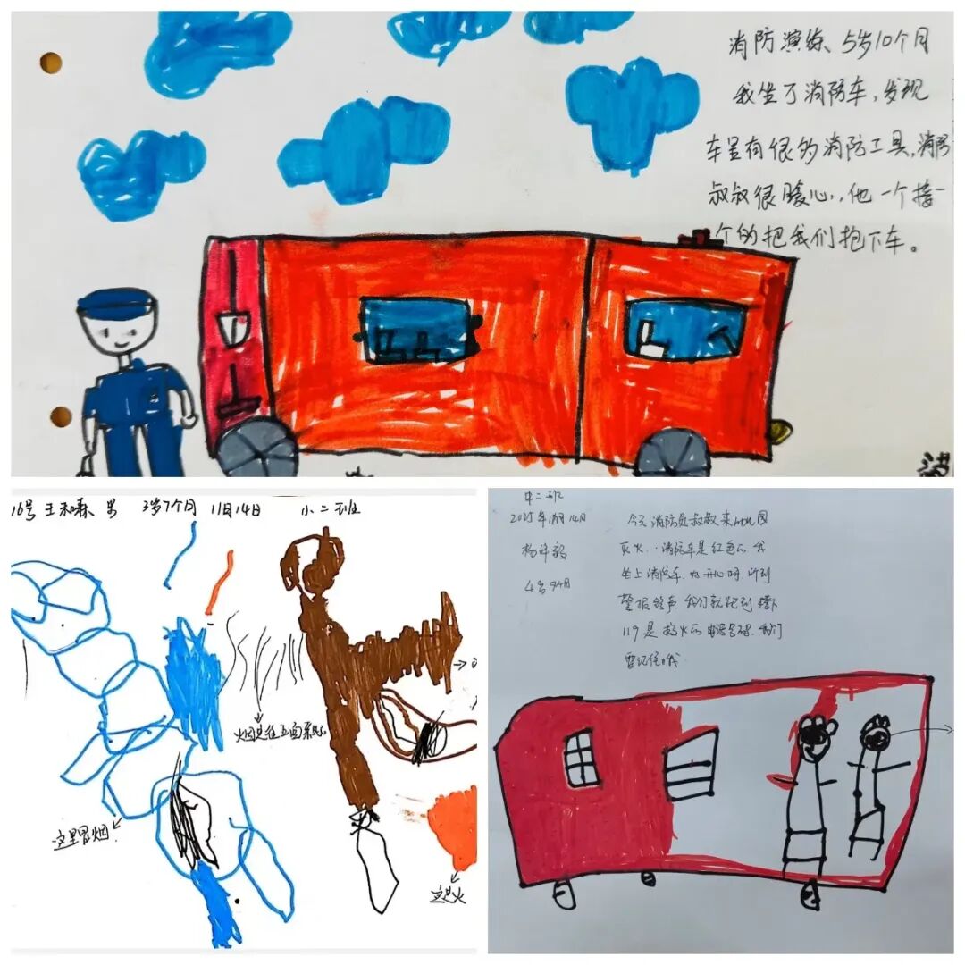 演练结束后,小朋友们用自己的方式记录了消防演练的过程,并表达了自己的所思所想,通过这一活动进一步提升了孩子的自我保护技能,强化了孩子的消防安全意识。