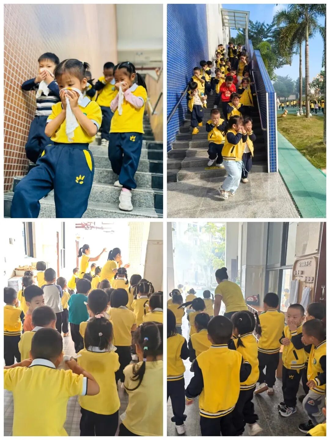 随着急促的警报声响起,消防演练活动正式开始。全体幼儿在班级老师的引导下,迅速用手捂住口鼻,弯腰低姿,按照预定的疏散路线,紧张而有序地从各班级向安全地带撤离。