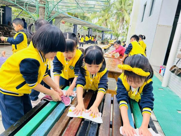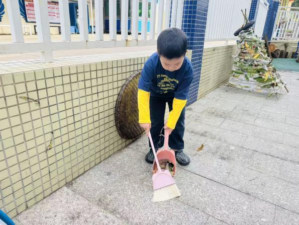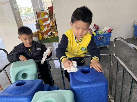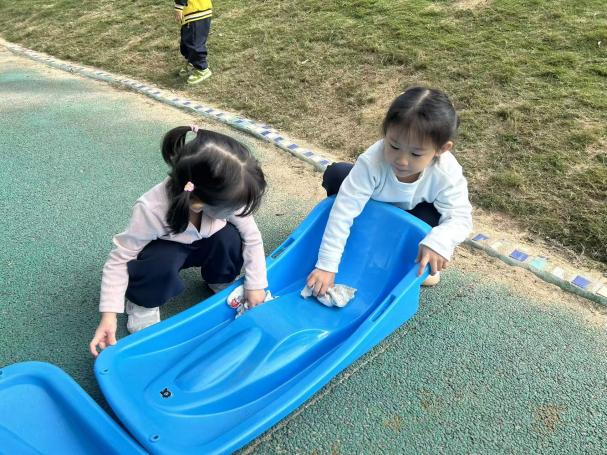 每周五为幼儿园卫生清洁日,孩子们化身“小小保洁员”,自带小扫帚、小抹布等清洁工具,有序来到游戏场地,有的弯腰清扫落叶碎屑,有的仔细擦拭积木、器械,有的互相配合整理玩具,忙得不亦乐乎。游戏场地被打扫得干干净净,孩子们也在实践中体会到了劳动的快乐与价值。
