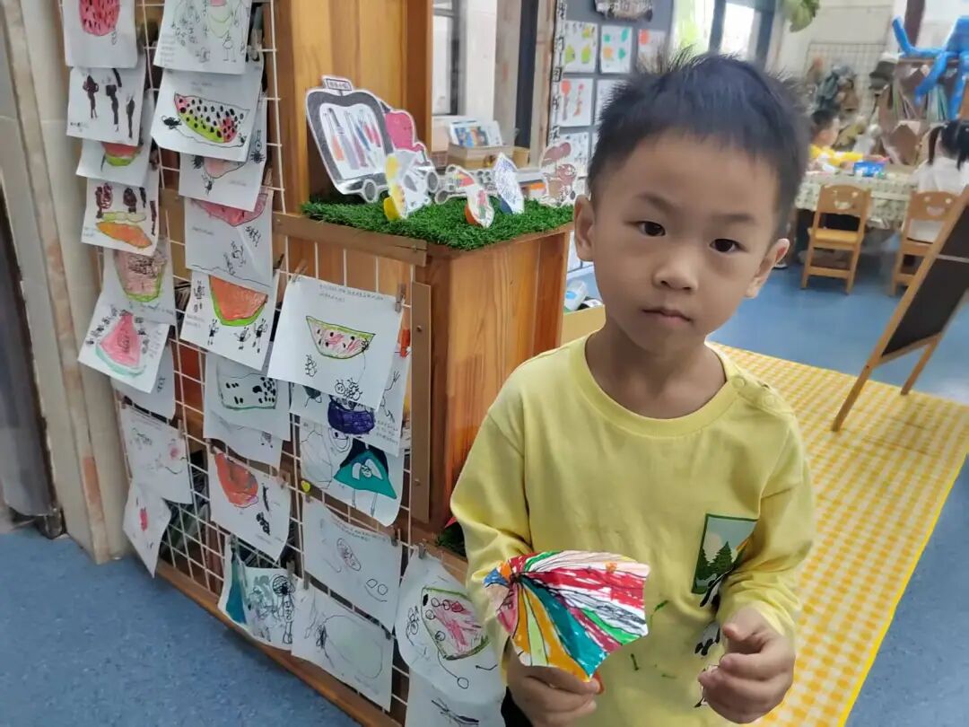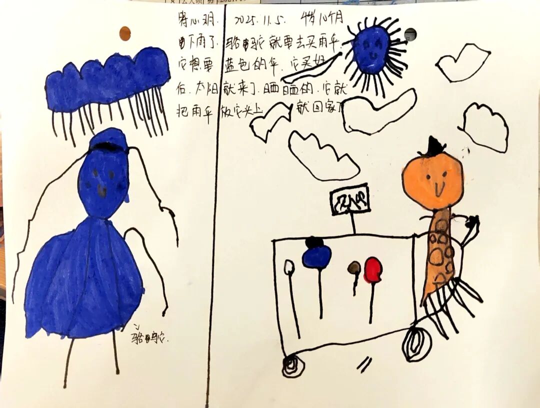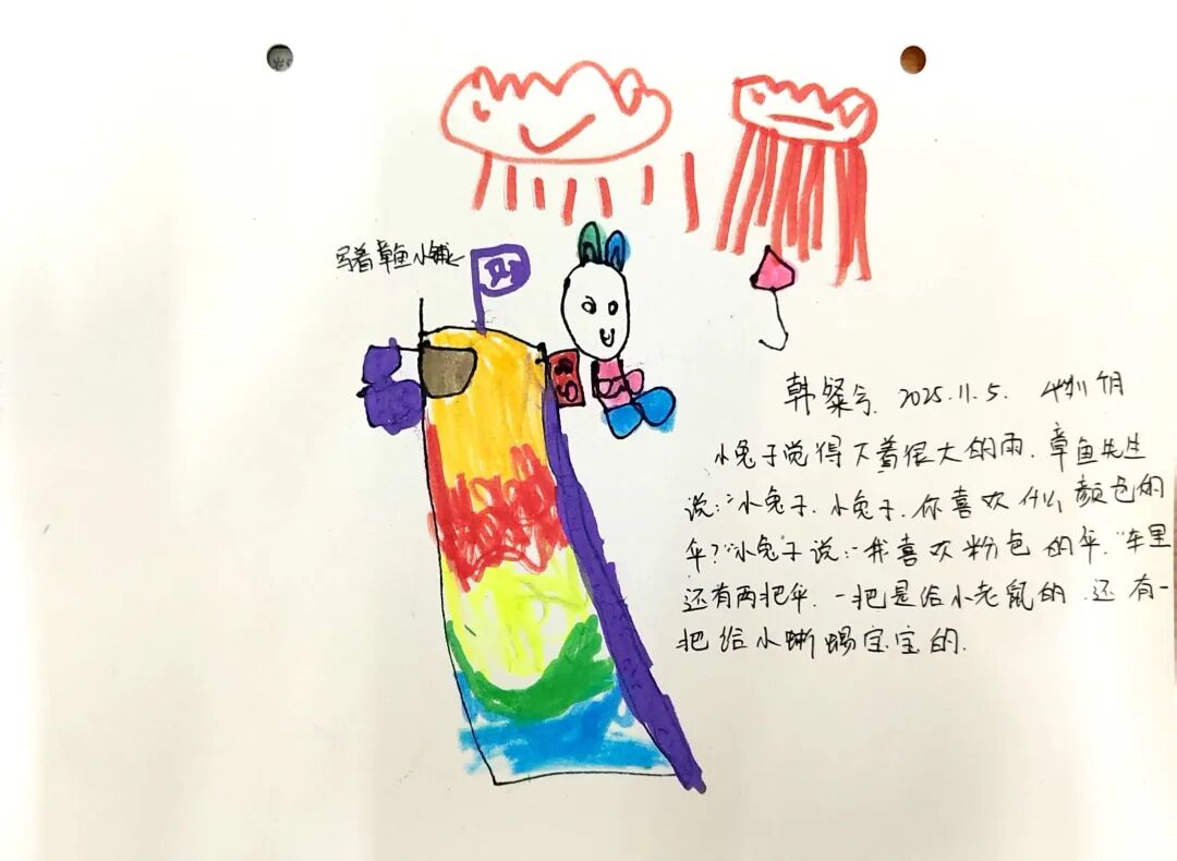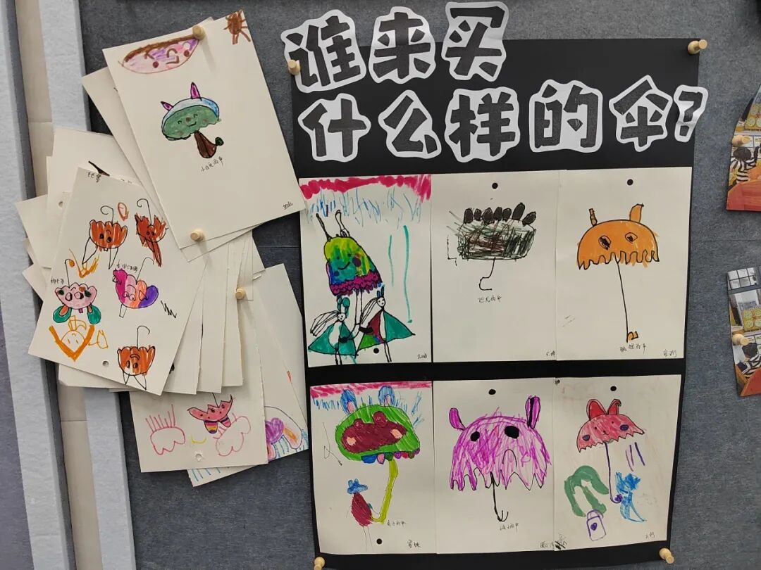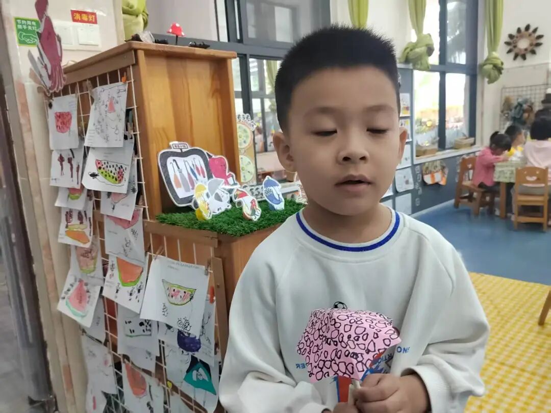 绘本里章鱼先生为不同动物准备合适雨伞的情节,激发了孩子们的创作灵感。我们准备了画纸、彩笔、手工材料,让孩子们化身“雨伞设计师”开展美术表征。有的孩子给小兔子画了“花瓣伞”,有的给大象画了超大号荷叶伞,还有的用折纸、粘贴做出迷你小雨伞。每一件作品,都是孩子对绘本的独特解读。