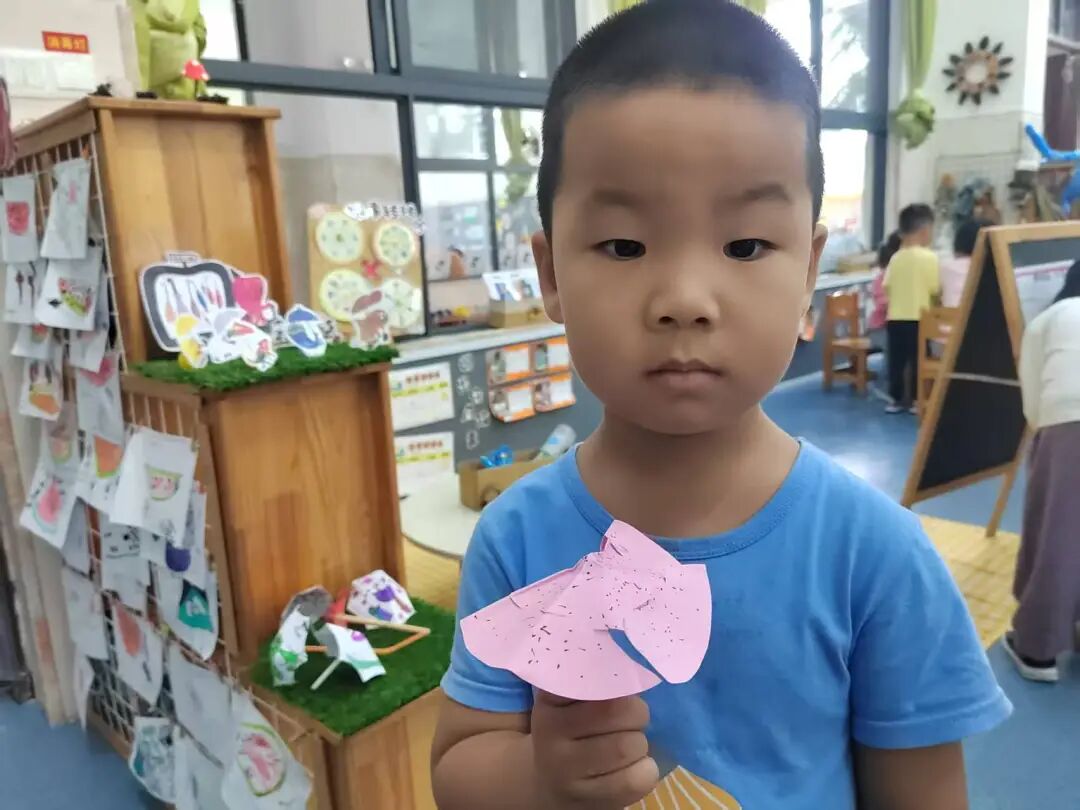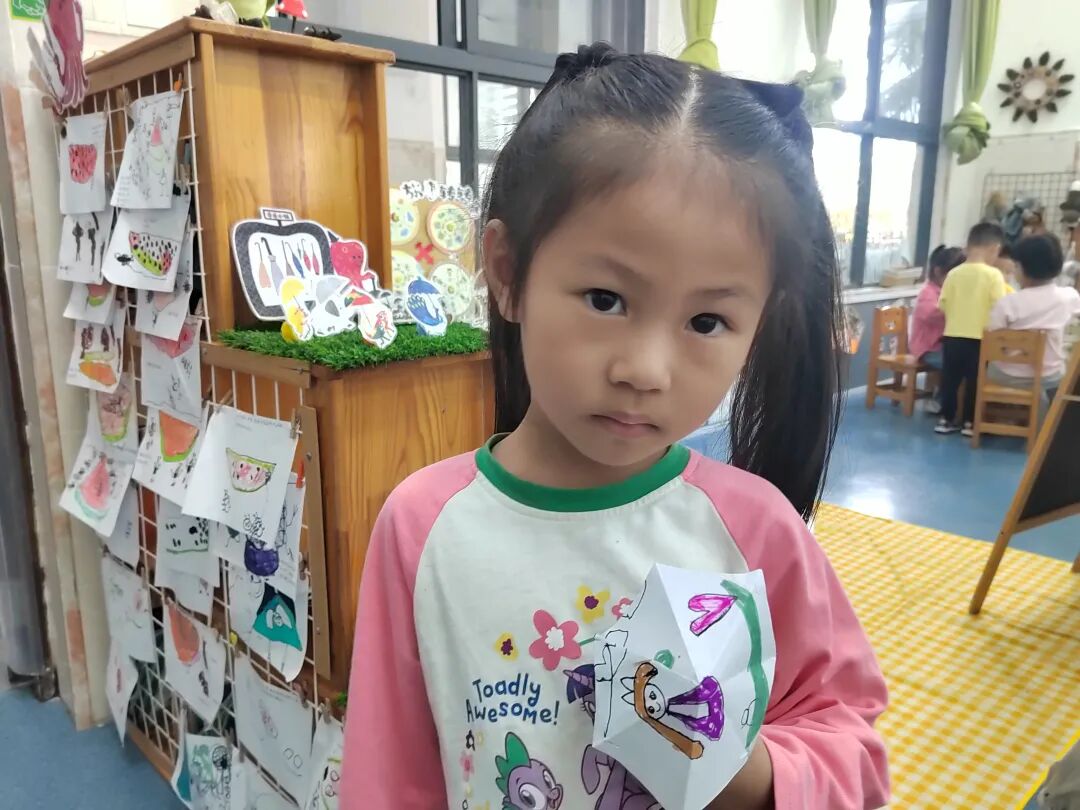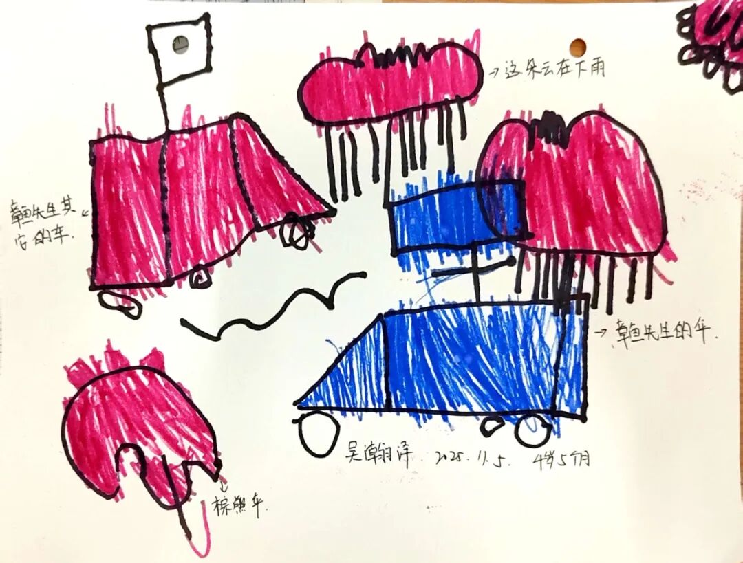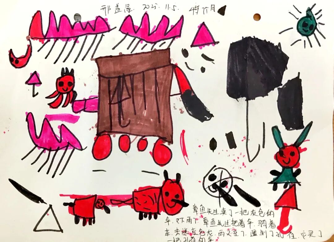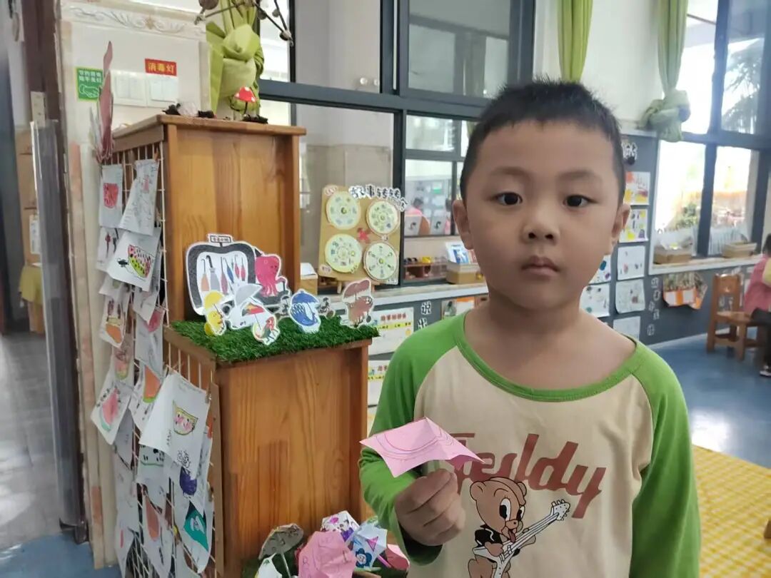 绘本里章鱼先生为不同动物准备合适雨伞的情节,激发了孩子们的创作灵感。我们准备了画纸、彩笔、手工材料,让孩子们化身“雨伞设计师”开展美术表征。有的孩子给小兔子画了“花瓣伞”,有的给大象画了超大号荷叶伞,还有的用折纸、粘贴做出迷你小雨伞。每一件作品,都是孩子对绘本的独特解读。