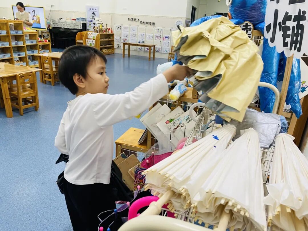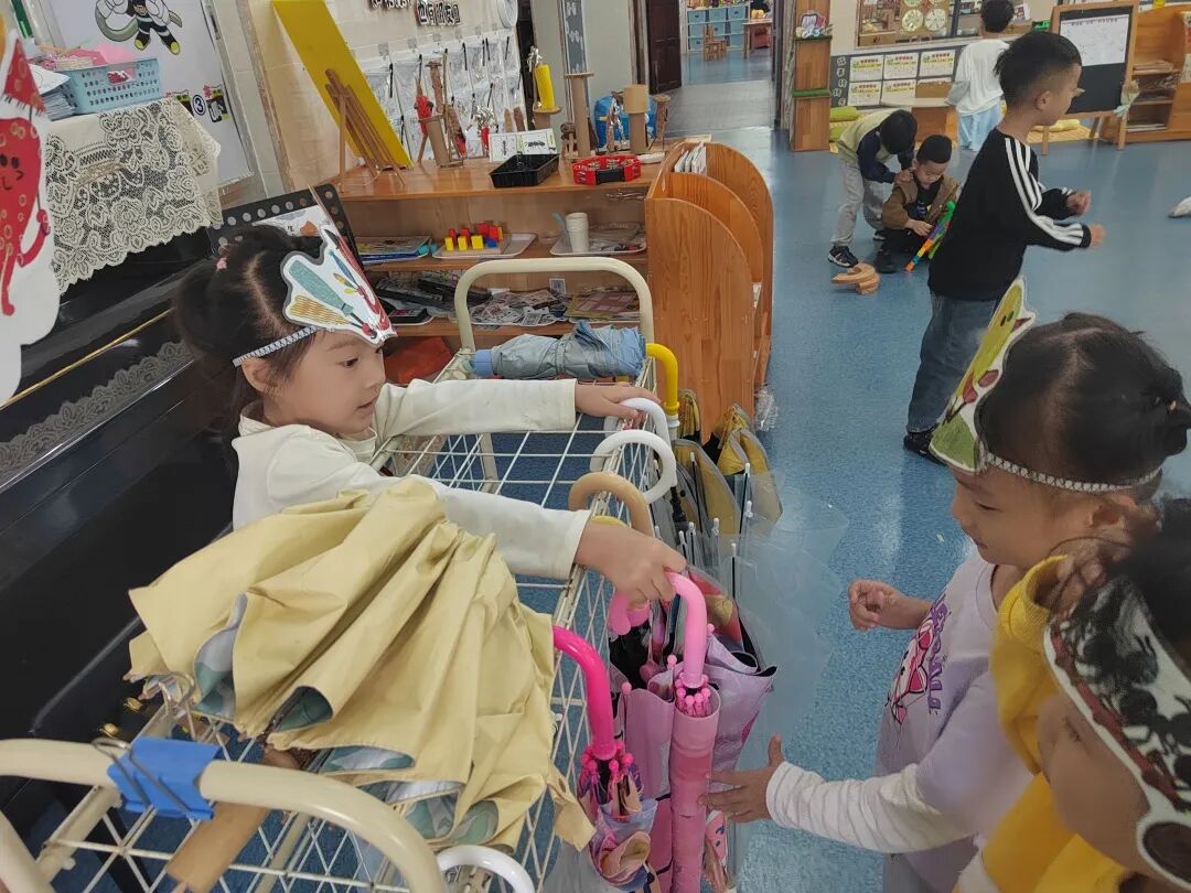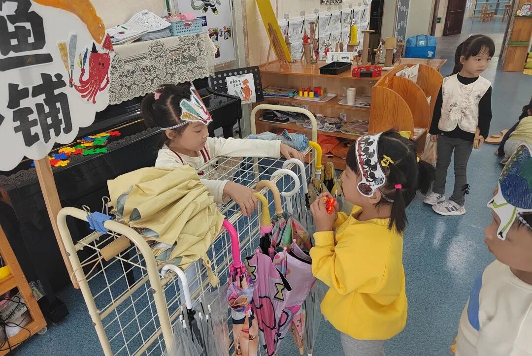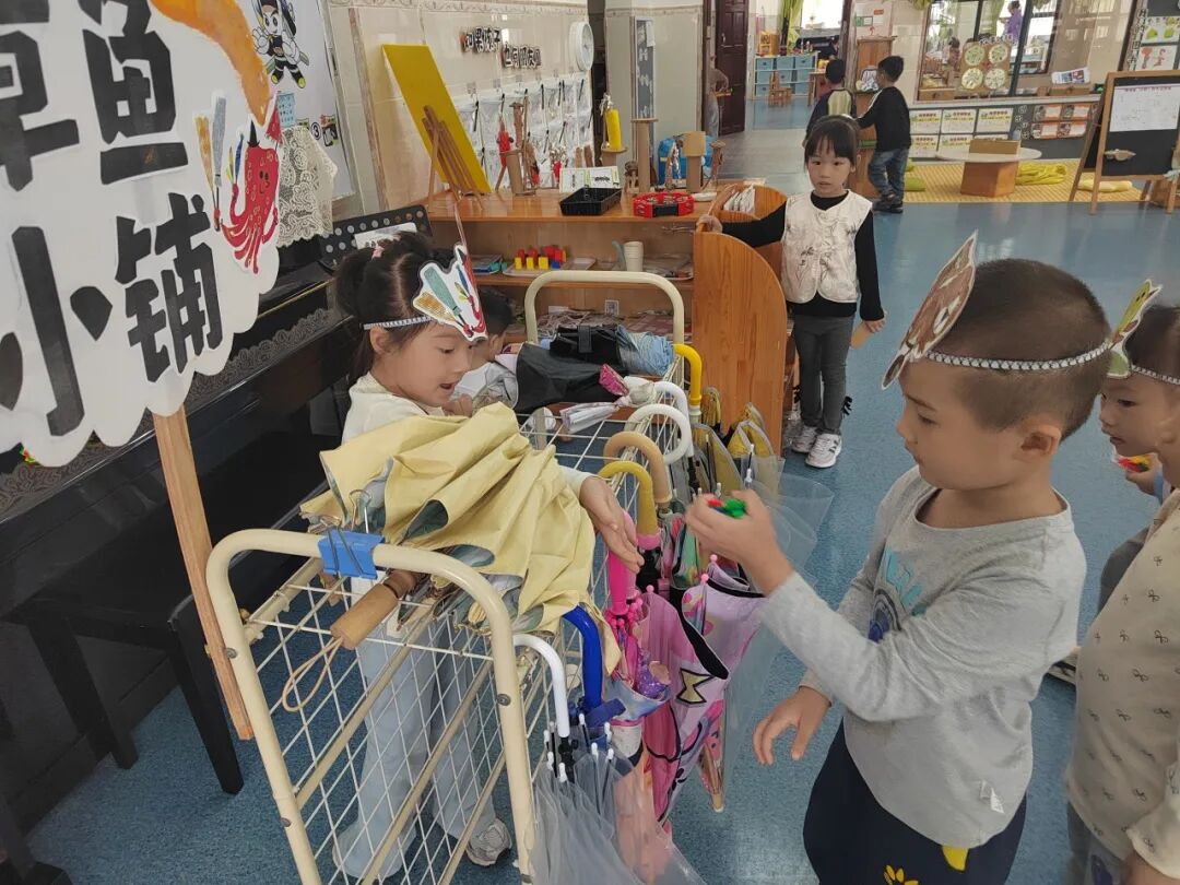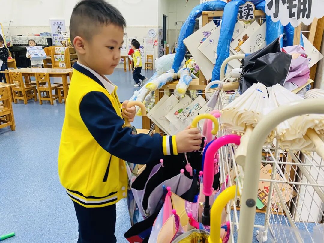 为了让绘本情节在户外鲜活起来,孩子自主生成了“奶茶店”主题的户外区域买卖游戏。孩子们自由分组认领“店长”“店员”“顾客”的角色,将之前亲手制作的创意雨伞、DIY的仿真奶茶当作游戏“商品”,还一起手绘可爱的店铺招牌、商定趣味兑换规则。没有市集的喧闹,只有纯粹的游戏快乐,小老板们守着自己的“小店”大声吆喝揽客,小顾客们认真挑选心仪的“商品”,还会和店家讨价还价,在一来一往的趣味互动里,孩子们不仅延伸了绘本故事,更锻炼了语言表达与社交协作能力。