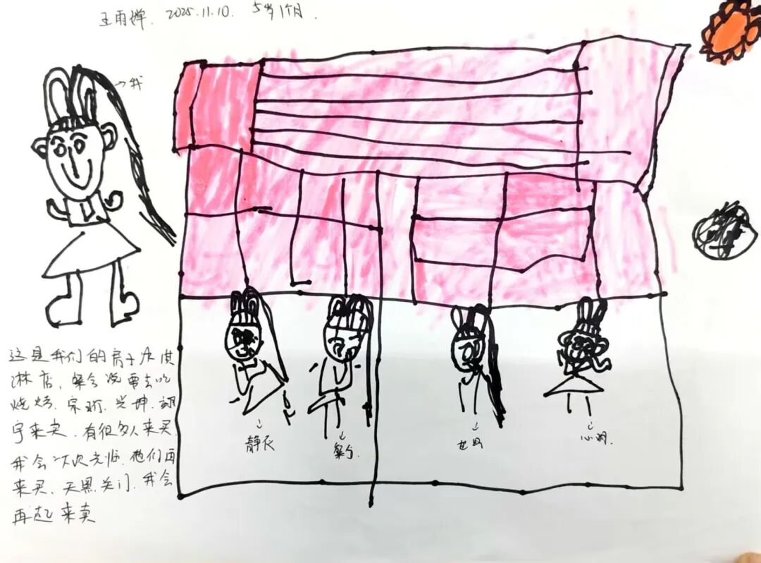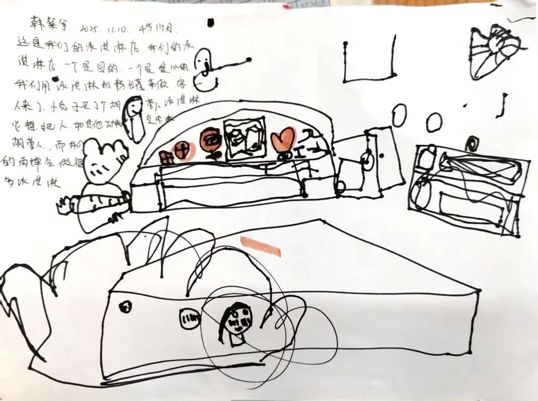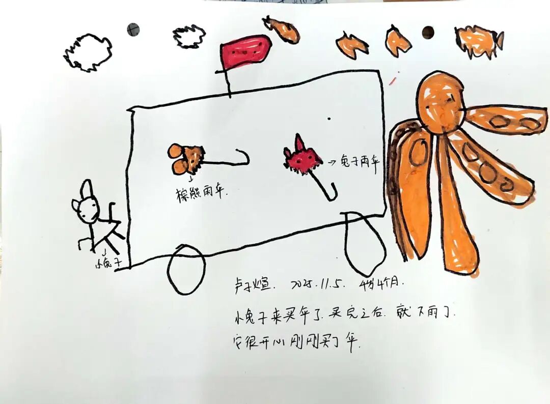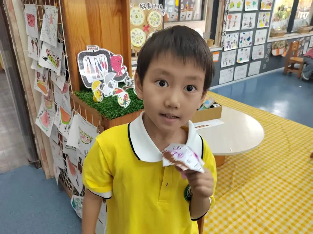 为了让绘本情节在户外鲜活起来,孩子自主生成了“奶茶店”主题的户外区域买卖游戏。孩子们自由分组认领“店长”“店员”“顾客”的角色,将之前亲手制作的创意雨伞、DIY的仿真奶茶当作游戏“商品”,还一起手绘可爱的店铺招牌、商定趣味兑换规则。没有市集的喧闹,只有纯粹的游戏快乐,小老板们守着自己的“小店”大声吆喝揽客,小顾客们认真挑选心仪的“商品”,还会和店家讨价还价,在一来一往的趣味互动里,孩子们不仅延伸了绘本故事,更锻炼了语言表达与社交协作能力。