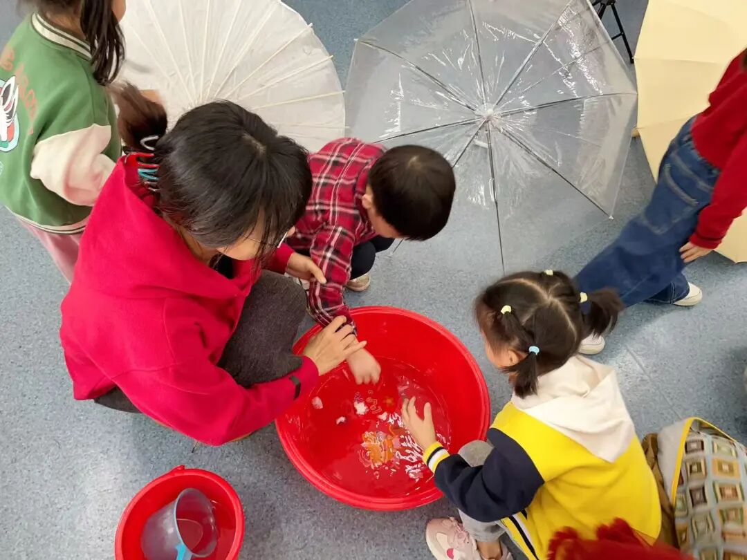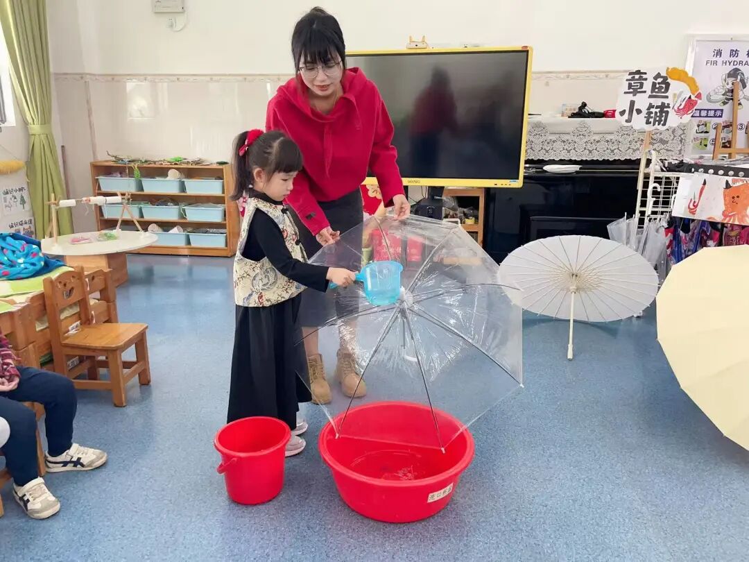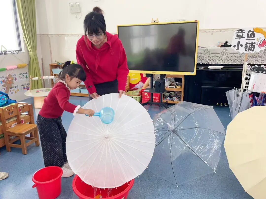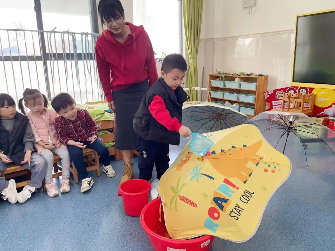 二是材质防水实验,孩子们往塑料、布面、纸伞三种伞面材料上洒水,直观观察防水效果,宗珩说“纸伞会破,因为纸放进水里就坏了”,晏姝则补充“纸伞涂了特殊的油,也能挡雨”,小小的科学种子就这样在孩子心中扎了根。