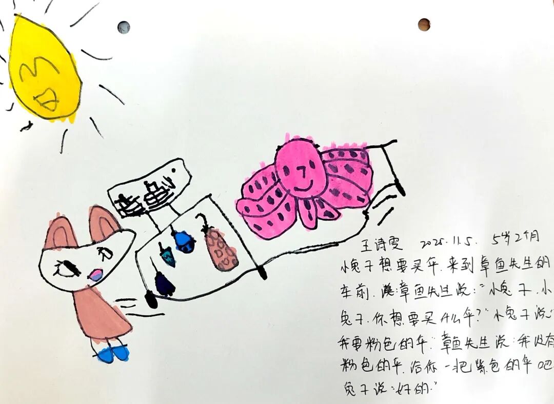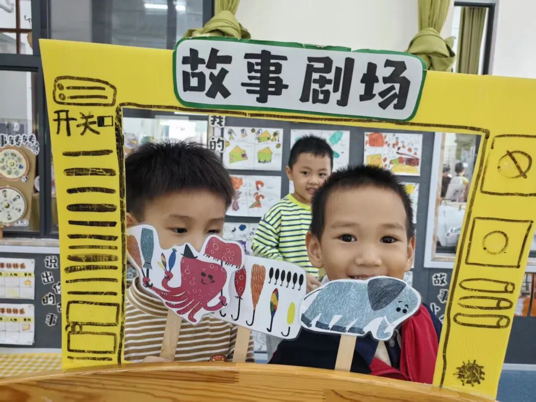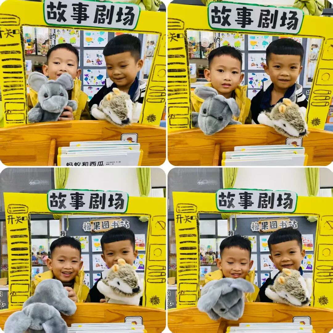 除了绘本片段讲述,我们还搭建了“故事剧场”开展语言表征。孩子们拿着动物手偶,有的还原章鱼先生卖伞的经典对话,有的创编新情节“章鱼先生把伞卖给了沙漠里的小骆驼”。稚嫩的童声里,是想象力与表达力的双重绽放。