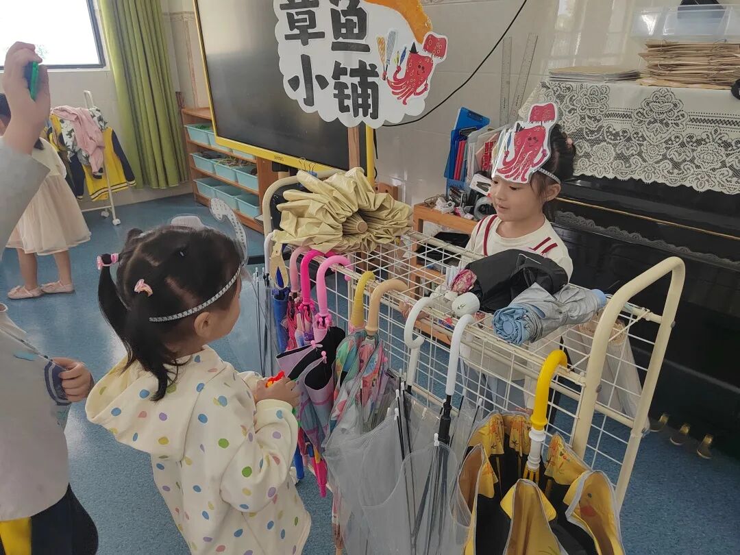 结合章鱼先生卖雨伞的情节,我们开展了戏剧表演游戏。孩子们分别扮演章鱼先生和小动物,有的学着吆喝“卖伞啦,卖伞啦!”,有的模仿小动物挑选雨伞。在角色扮演中,孩子们体验了社交互动,也学会了换位思考与共情。