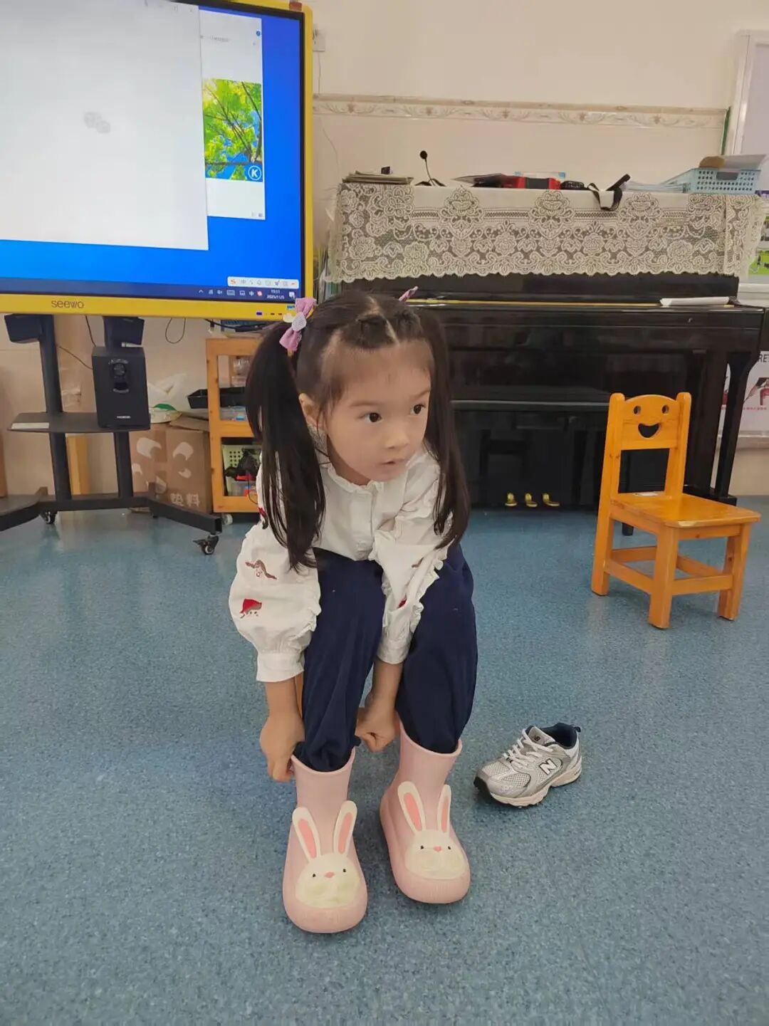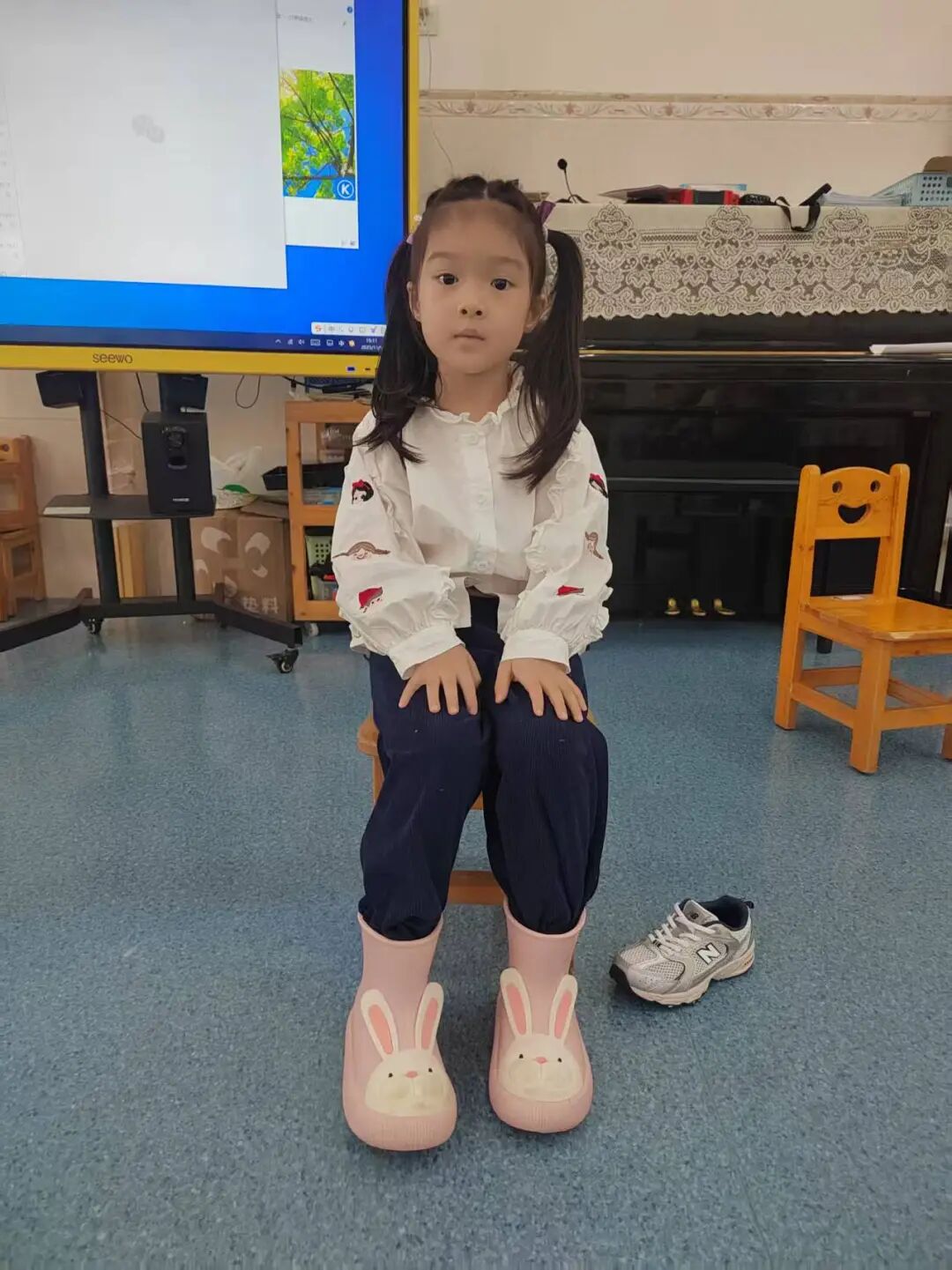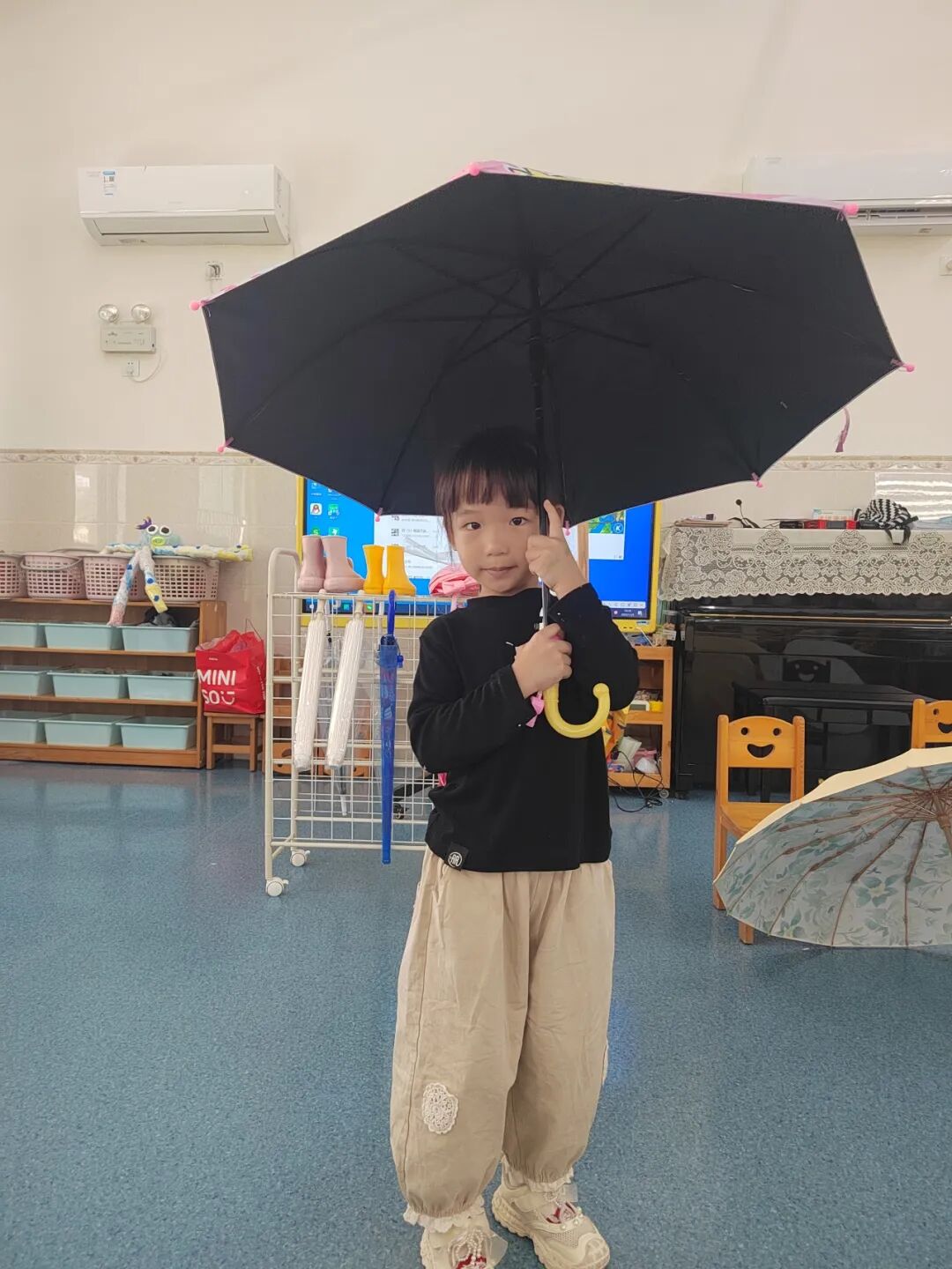 孩子们先跟着节奏图谱练节拍,再分组协作合奏,奏响了童趣满满的“雨伞小店音乐会”。在敲打中,孩子们不仅提升了节奏感,更用音乐的方式重温了绘本的欢乐。