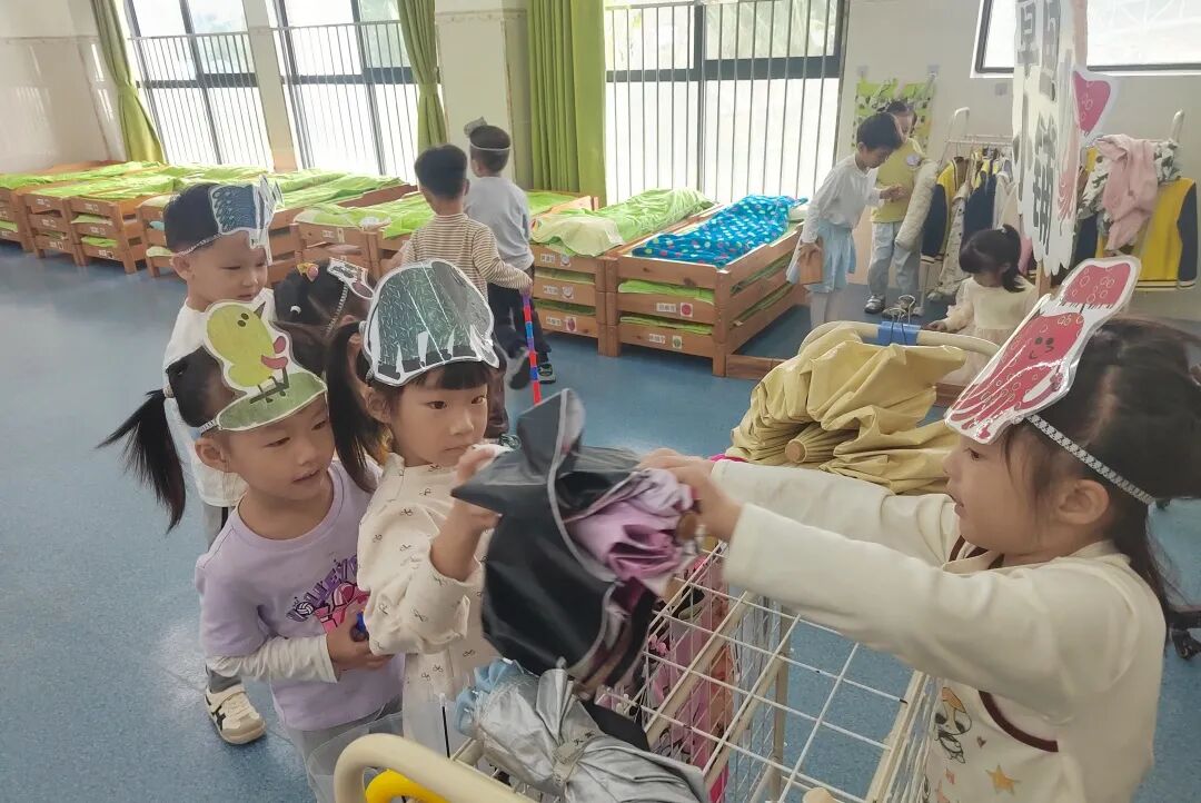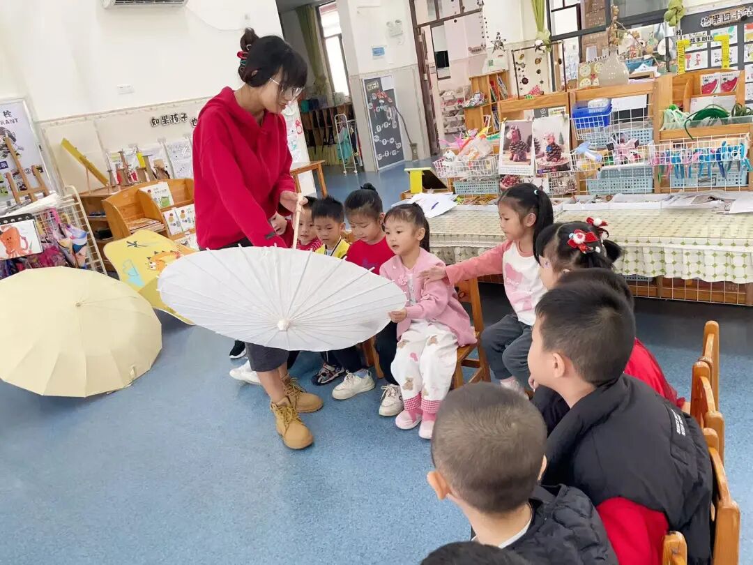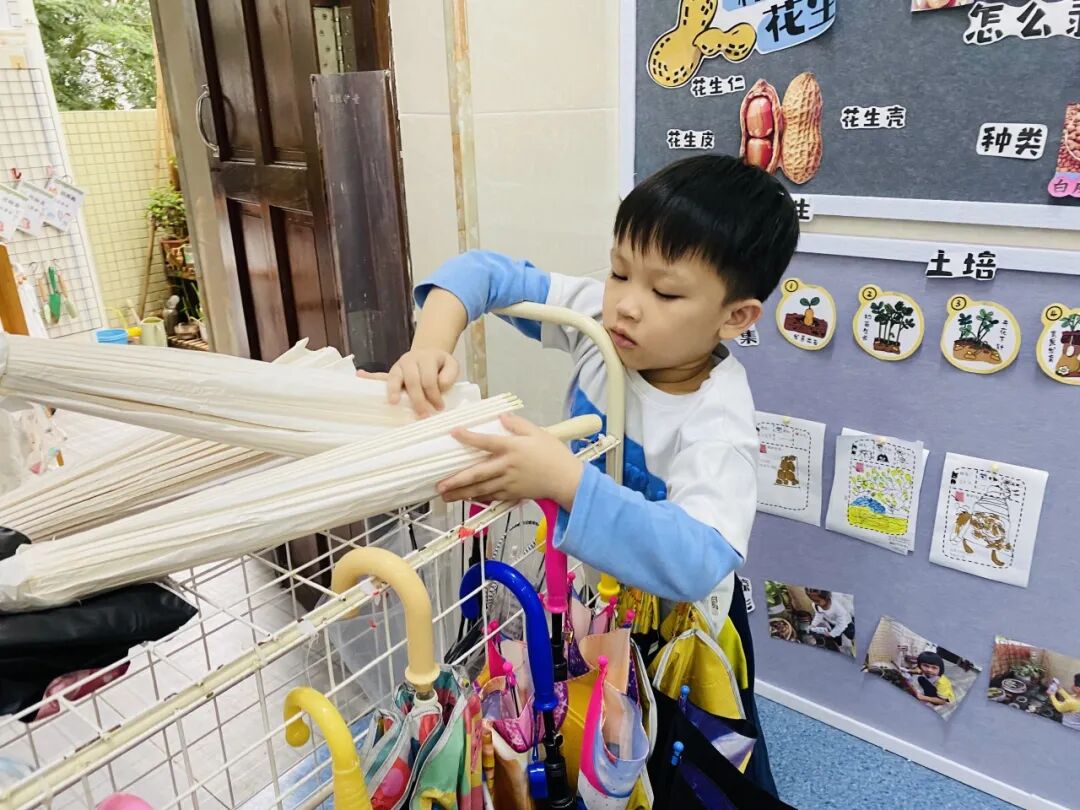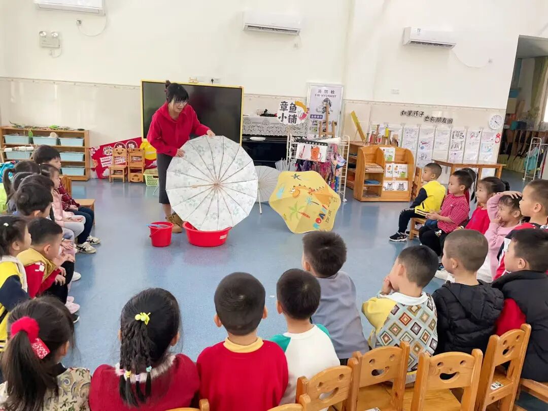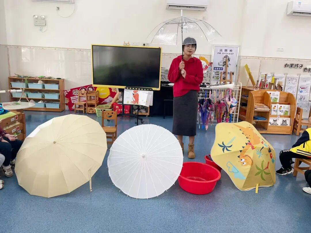 我们还设计了“整理雨伞”的生活游戏,教孩子学习折叠、整理雨伞的方法。孩子们认真跟着老师学折伞、收伞,慢慢养成了收纳的好习惯,让绘本知识真正融入生活。
