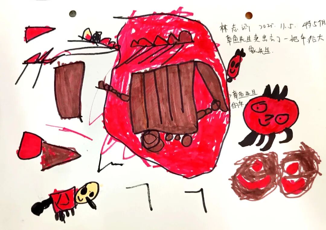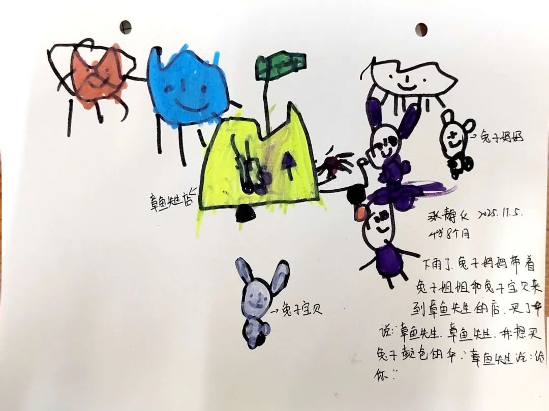 我们将绘本与打击乐结合开展音乐表征活动,用手摇铃、沙锤、木鱼的音色对应故事场景:手摇铃晃出章鱼先生出摊的脚步声,沙锤模拟小雨沙沙声,木鱼代表小动物选伞的惊喜。