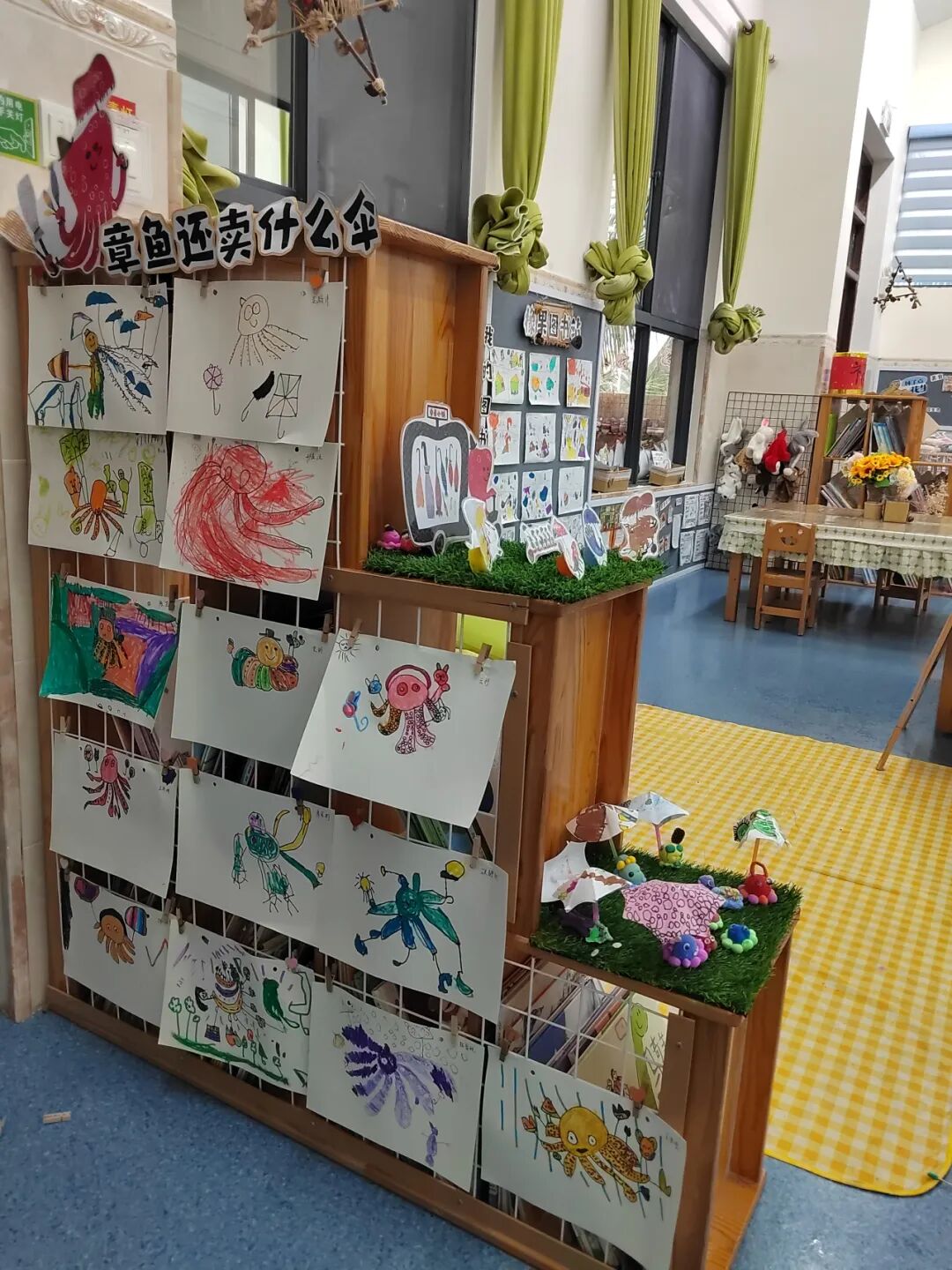我们在阅读区投放了《章鱼先生卖雨伞》绘本分册,让孩子开启自主阅读之旅。孩子们三三两两围坐,有的独自翻页小声念叨情节,还有的拉着同伴分享自己发现的绘本小彩蛋。