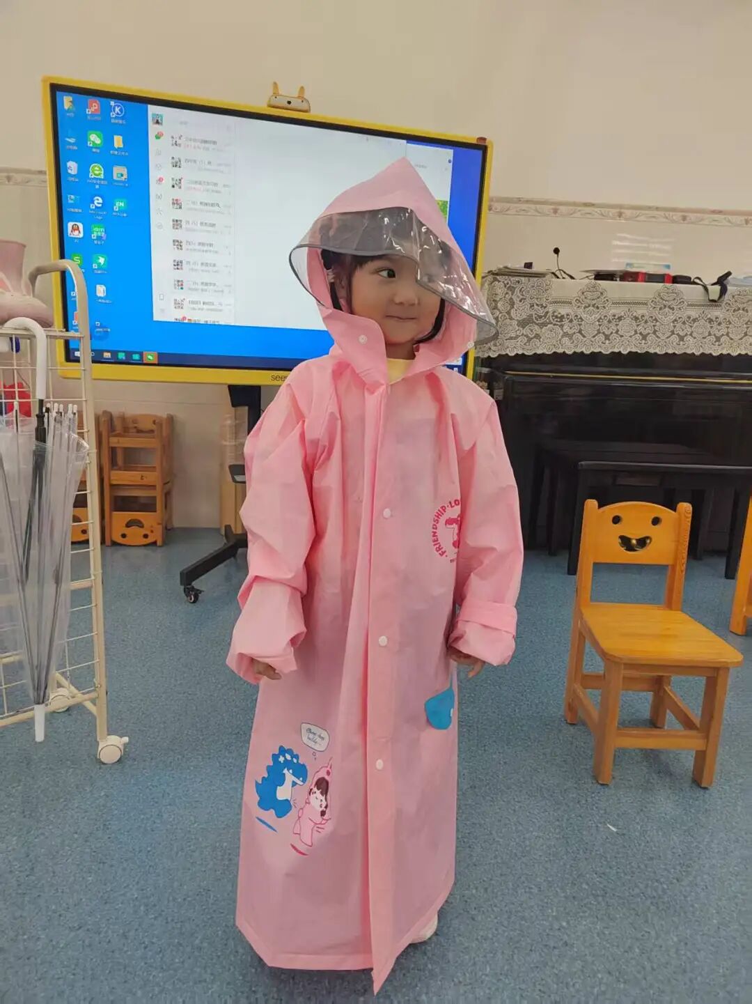从绘本里的雨天场景,我们延伸出了雨天防护的情景教学。老师通过提问“下雨天出门要带什么?”“淋雨了会怎么样?”,教孩子们掌握穿雨鞋、带雨伞、避雨等基本的雨天防护知识,帮助孩子树立自我保护意识。