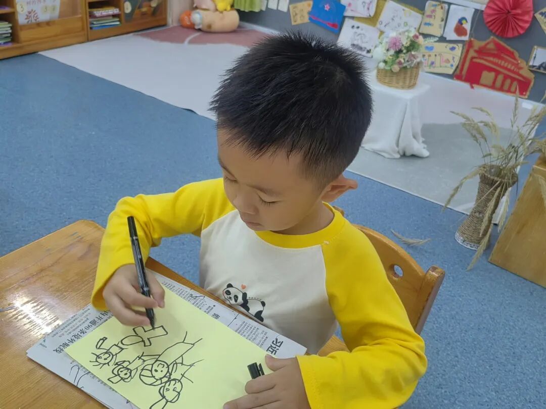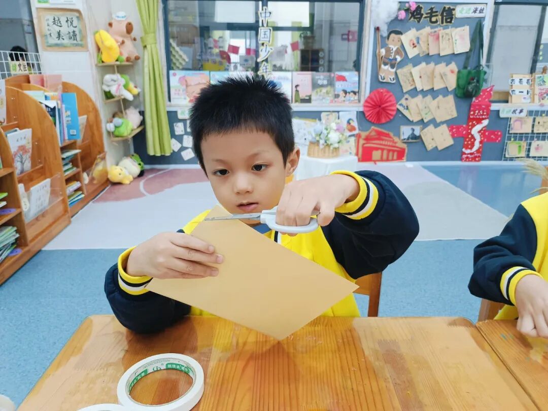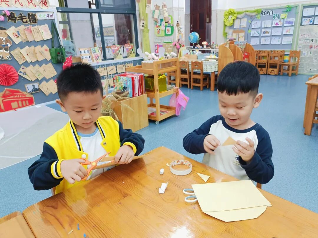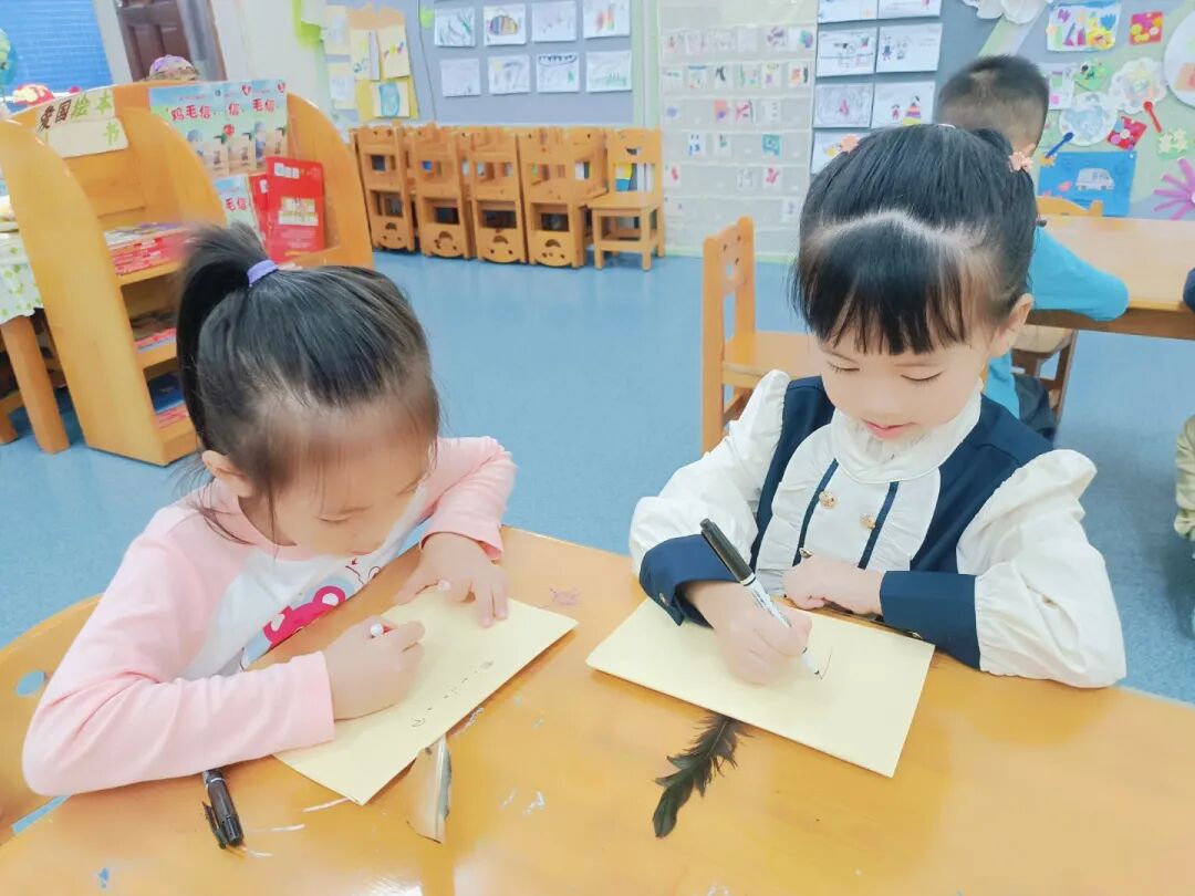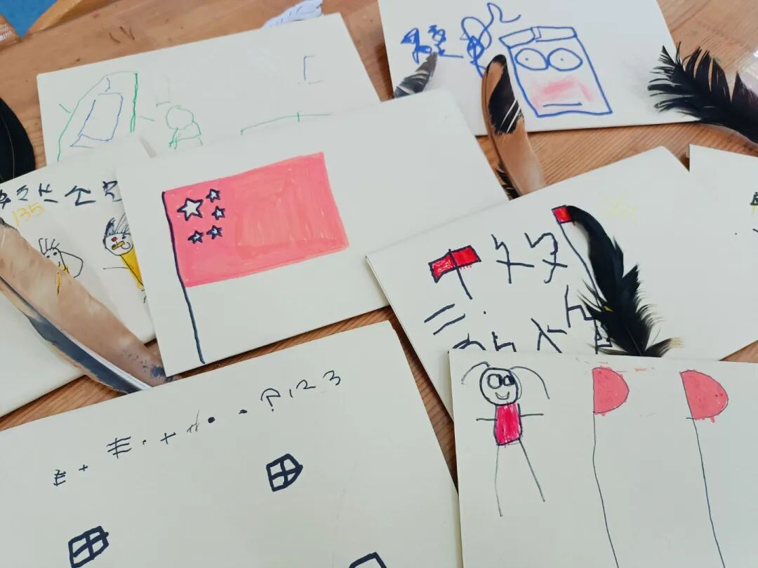“我的鸡毛信要写给祖国妈妈,祝她越来越棒!”“我要在信上画国旗,还有勇敢的海娃!”彩色卡纸、羽毛、画笔齐上阵,宝贝们认真地写下心里的话,每一封专属鸡毛信,都藏着浓浓的爱国情。