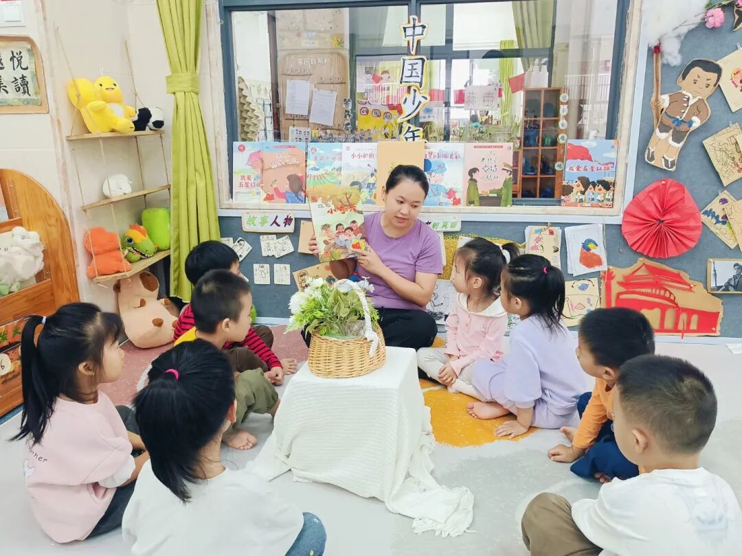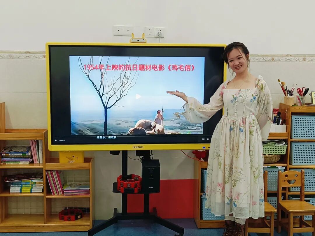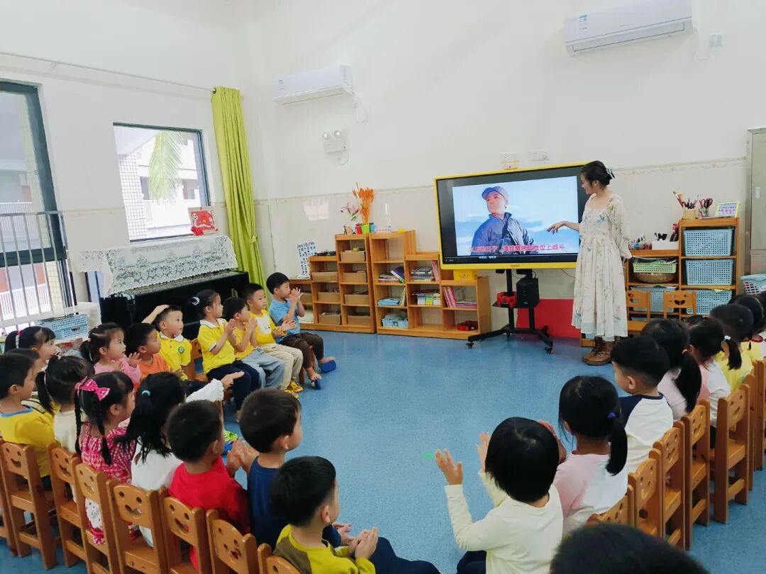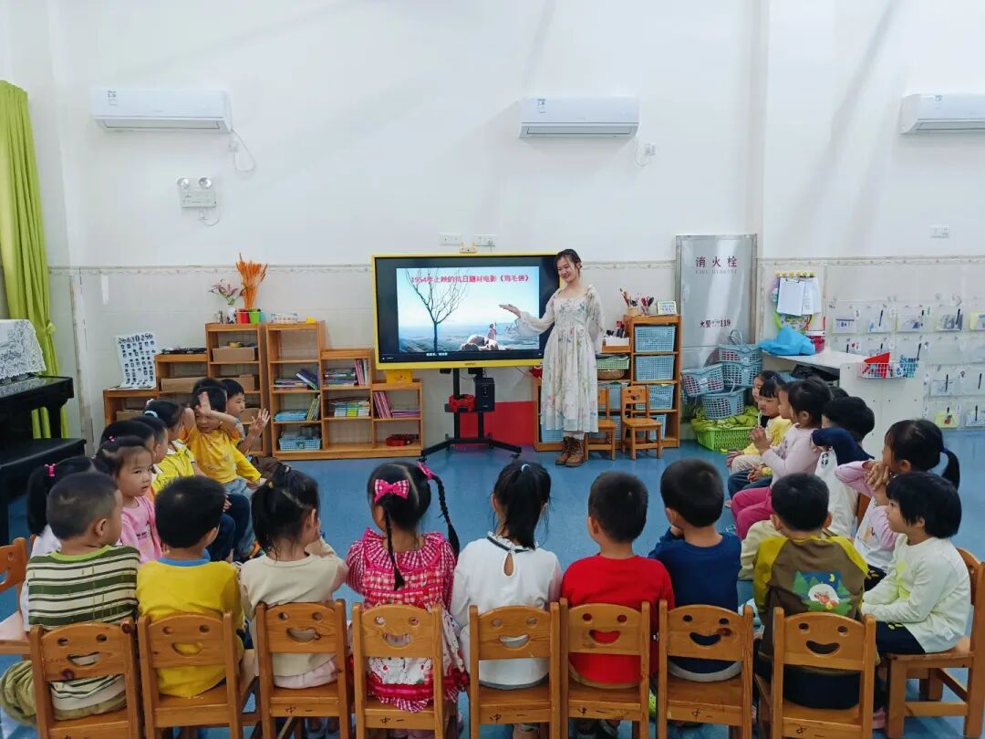 “海娃遇到敌人为什么不害怕?”“如果是我,我会像海娃一样保护鸡毛信吗?”围坐成圆圈,宝贝们大胆分享:“因为海娃要帮八路军,所以他很勇敢!”“我也会保护重要的东西,做勇敢的小朋友!”你一言我一语,把对“勇敢”“责任”的理解,悄悄记在心里。