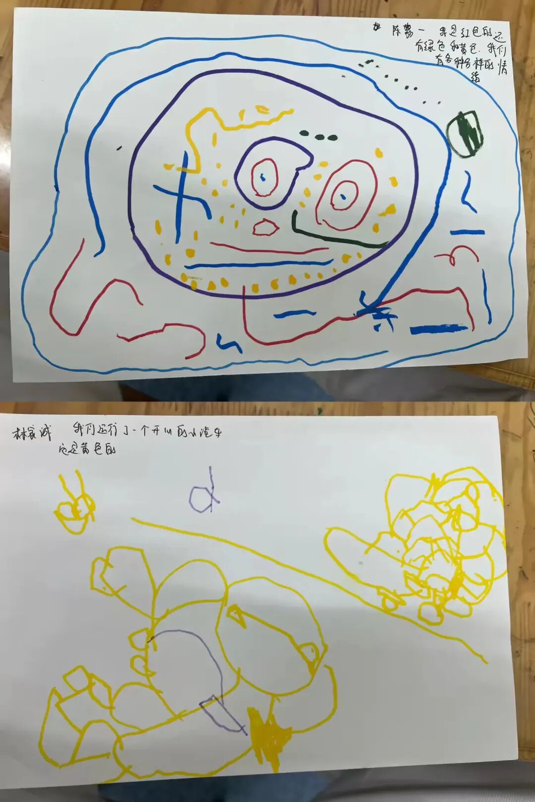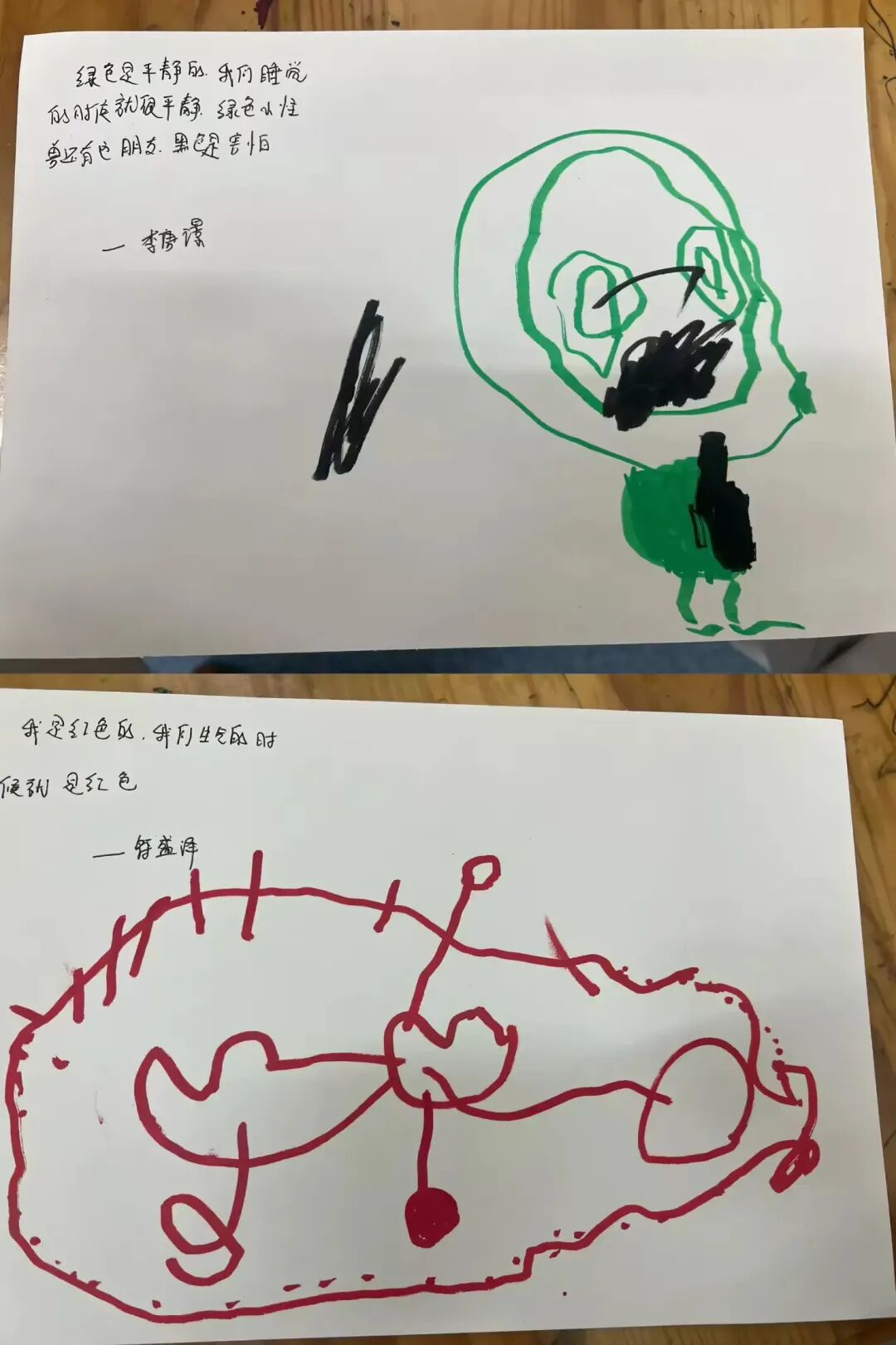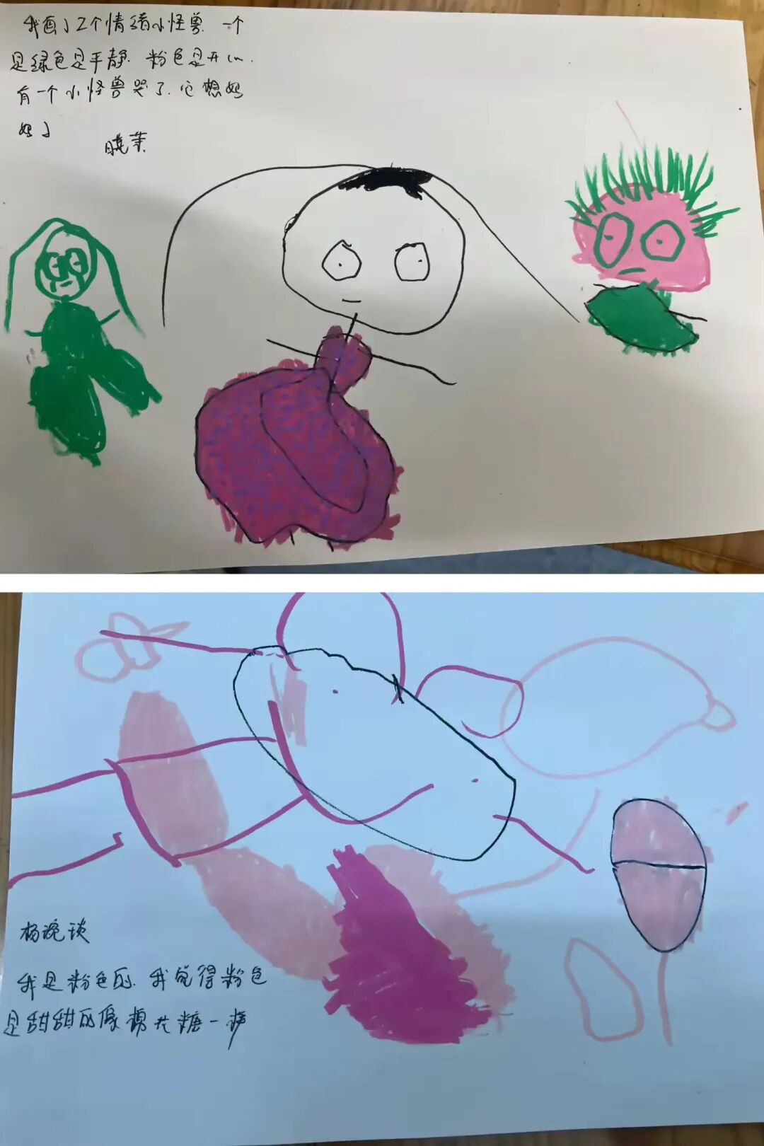 伴着孩子们对“情绪小怪兽”的认知慢慢深入,我们始终鼓励孩子大胆表达内心的喜怒哀乐。通过绘本《我情绪小怪兽》,小朋友读完绘本后有很多很多的想法,他们通过颜色和形状,画出了自己的想法,还有他们的创意。