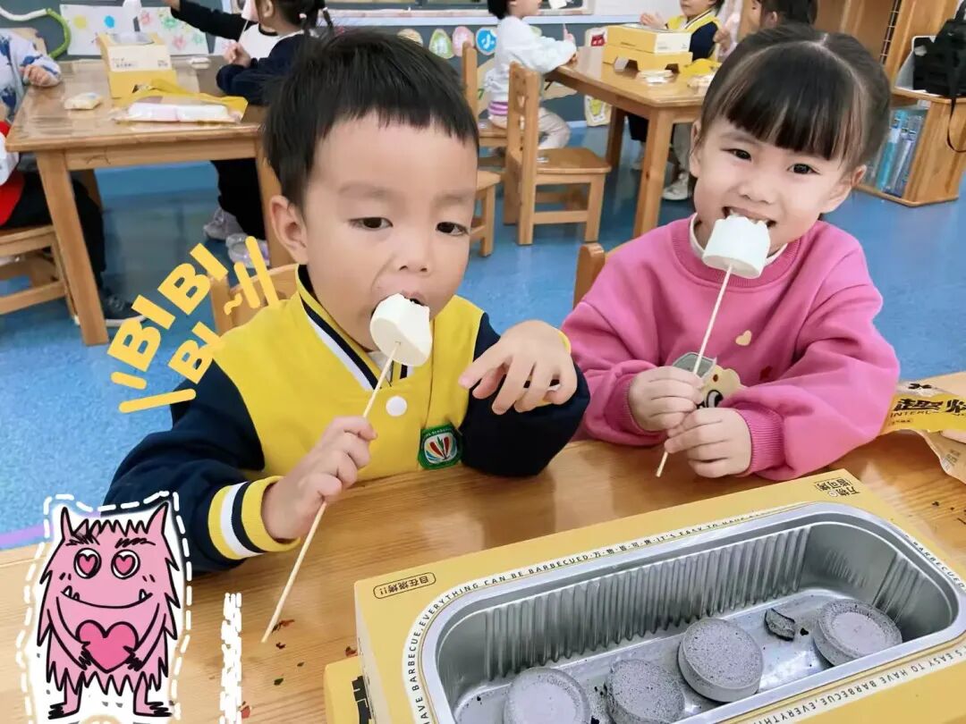 粉嫩甜意盈溢,今天孩子们在教室里烤棉花糖,笑声充满了整个房间,他们兴奋地分享着自己制作的棉花糖,脸上洋溢着幸福的笑容。今天我们都是粉色的。