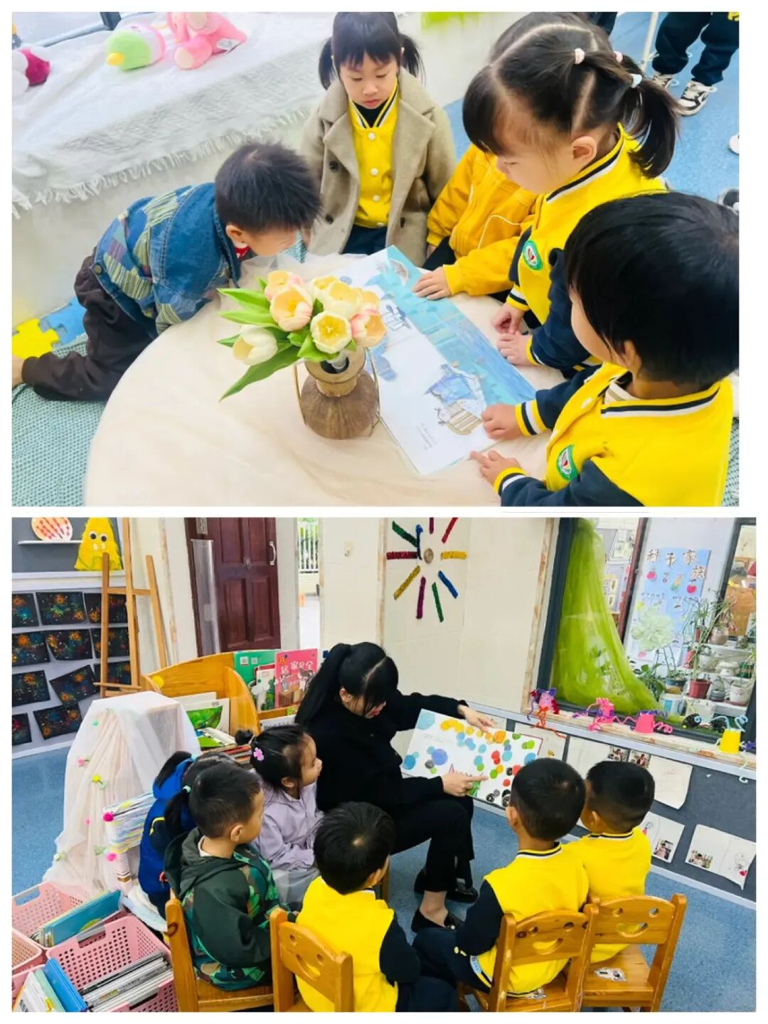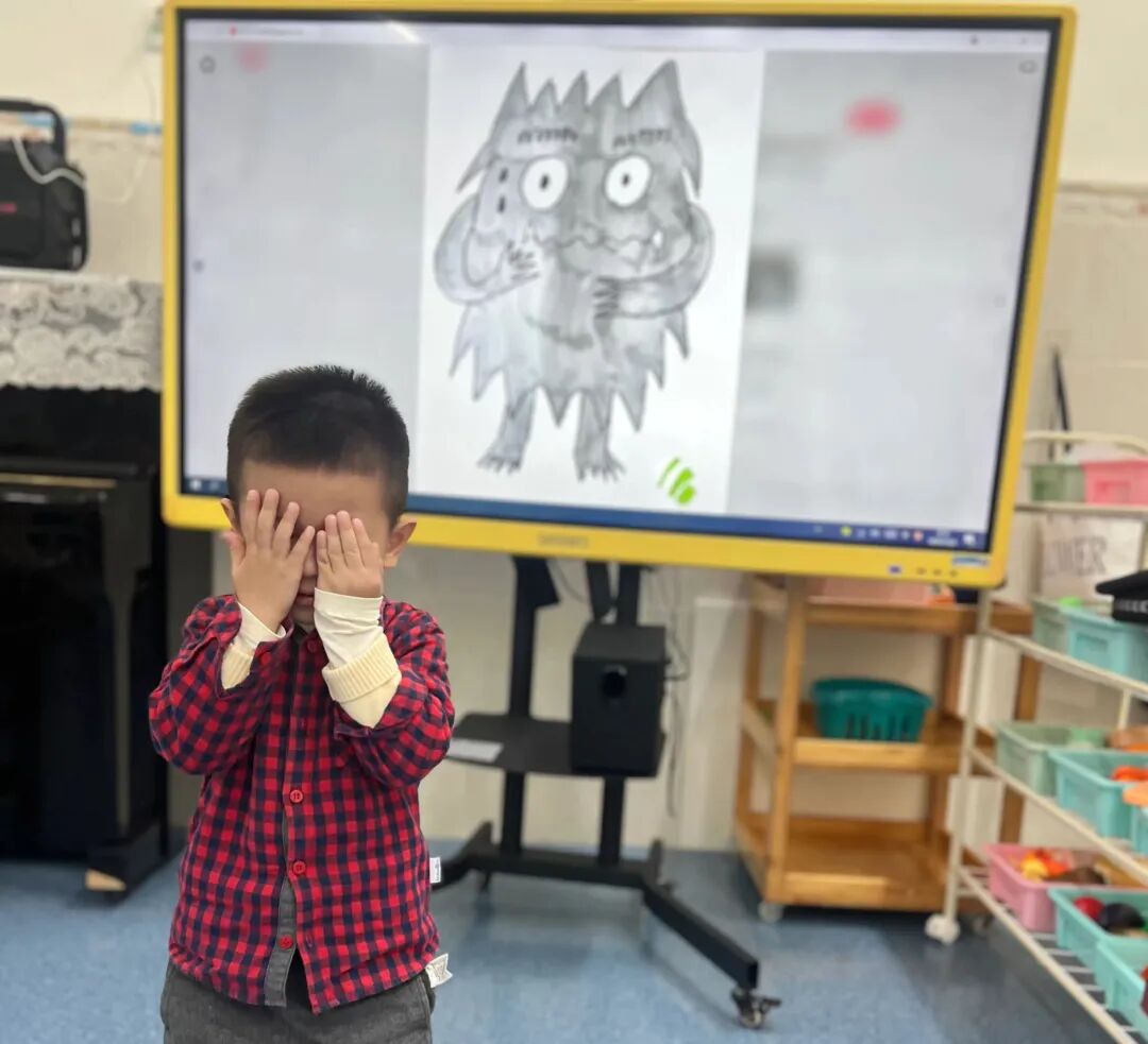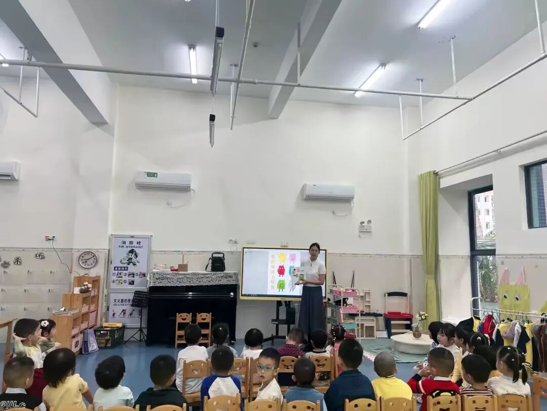 小一班老师把《我的情绪小怪兽》绘本带到孩子们面前。绘本里五颜六色的小怪兽、柔软可爱的画面、简单易懂的故事,瞬间吸引了孩子们的目光。大家围坐在一起,小脑袋凑得紧紧的,好奇地追问着关于小怪兽的一切。