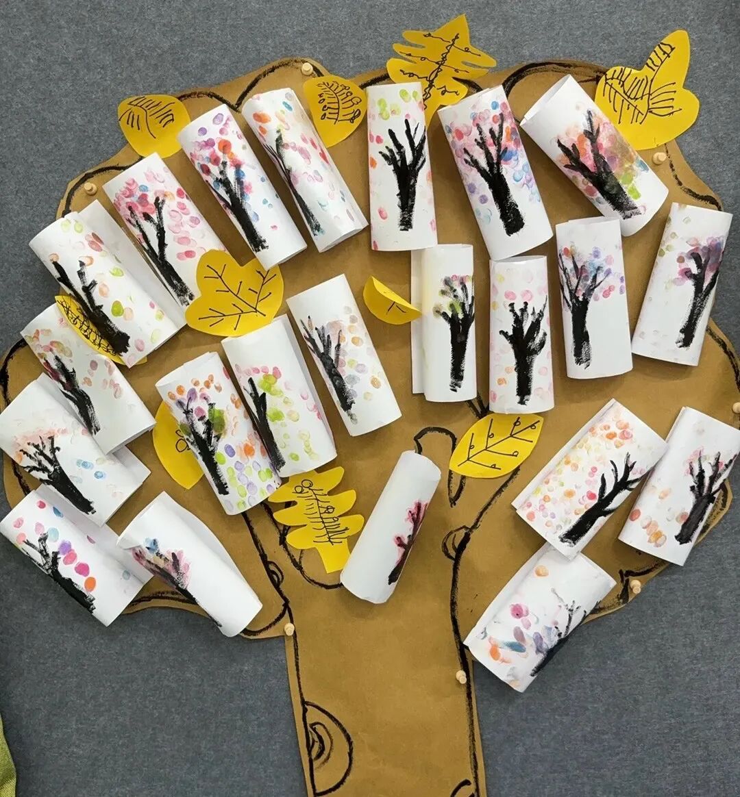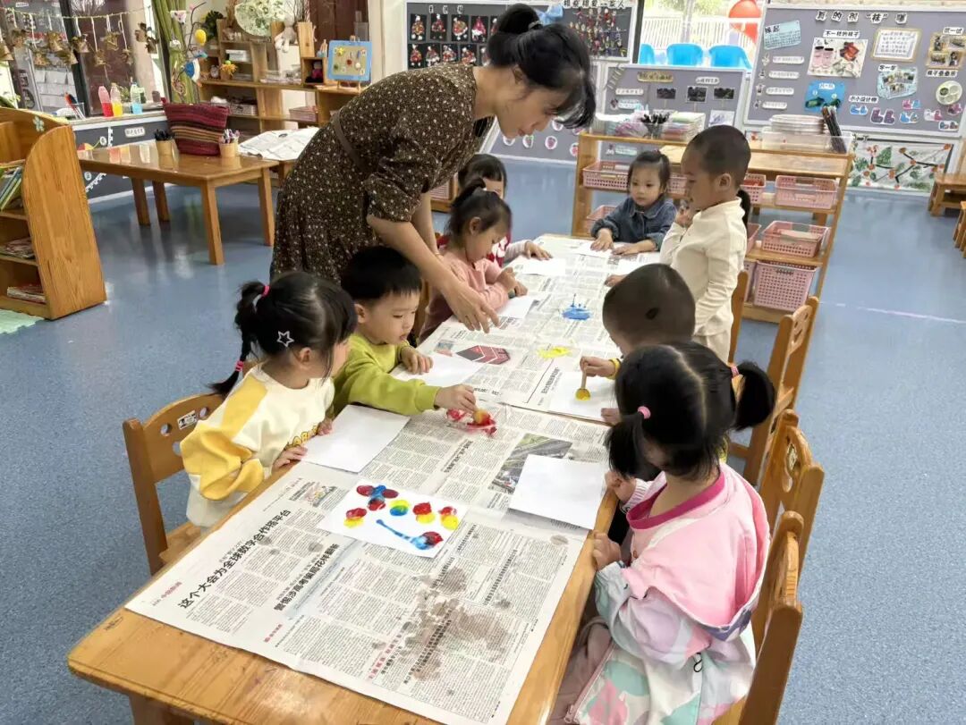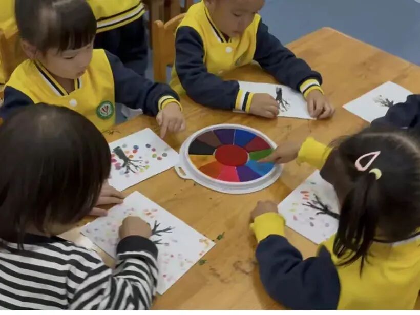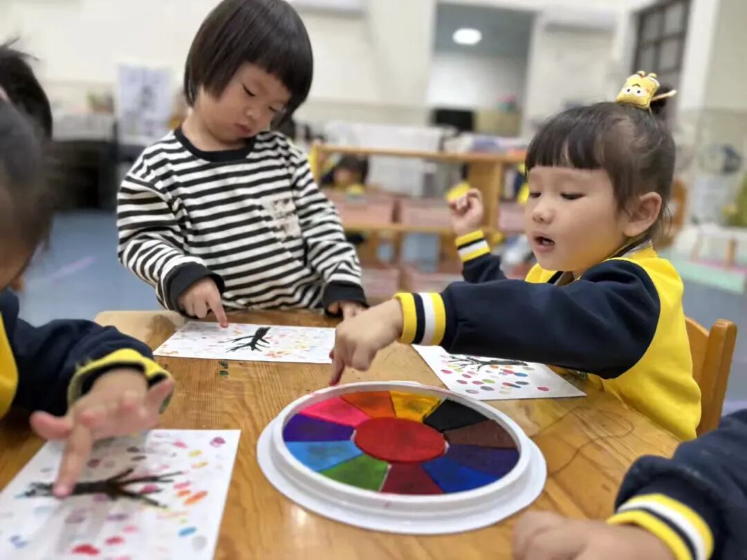 孩子们用手指蘸取不同颜色的颜料,在画纸上按压出层层叠叠的树叶。有的孩子尝试混合三原色,让绿色的树叶中透出黄色的阳光,有的则用指尖点画飘落的红色、黄色叶子,创作属于自己的彩色大树。