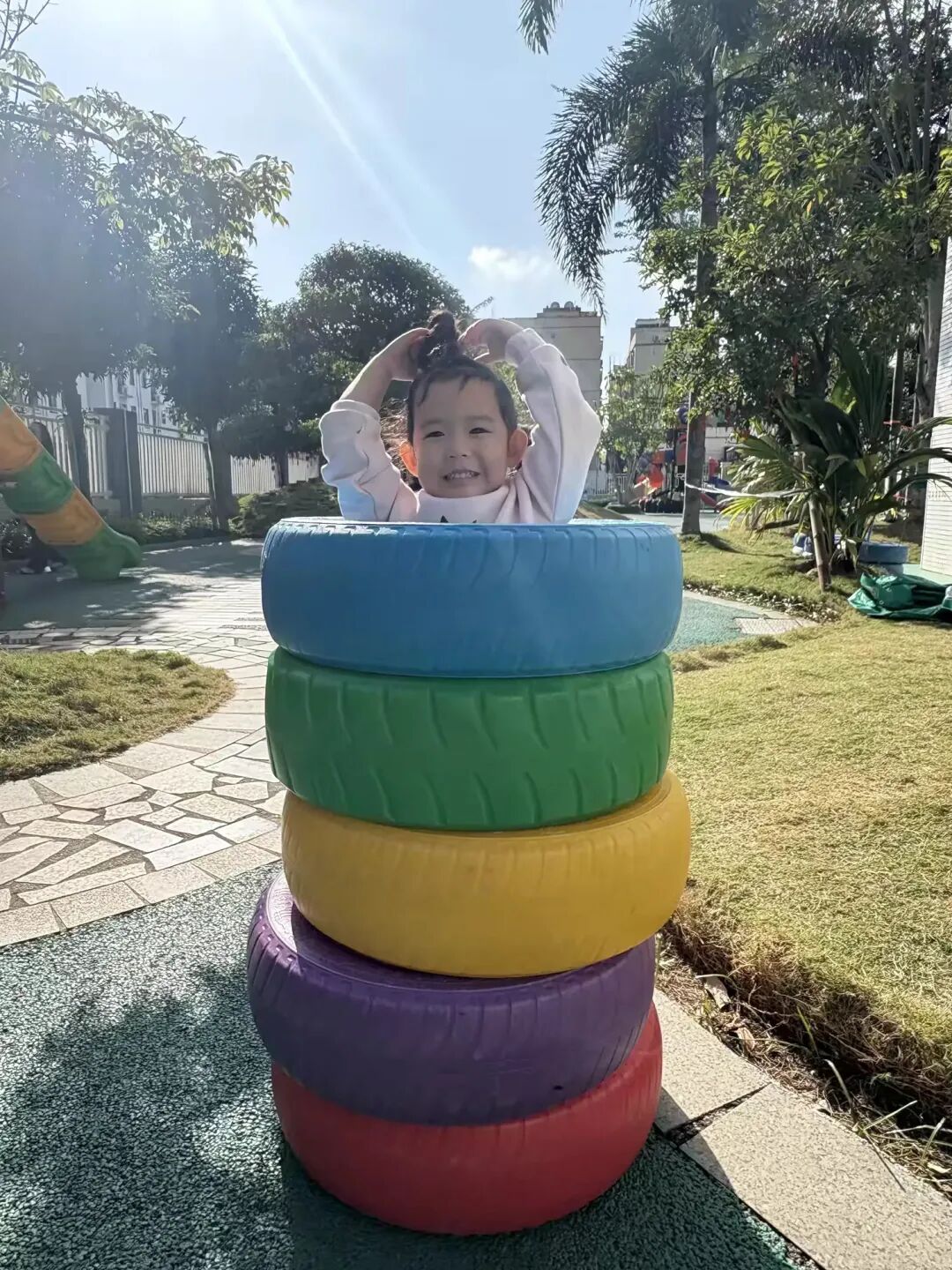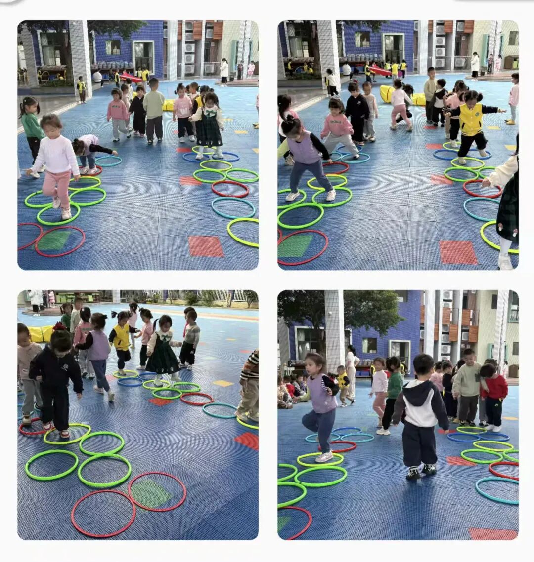 户外场地摆放着彩色圆圈,老师说出颜色指令后,孩子们迅速找到对应颜色的圆圈并跳进去。有的孩子还会创造性地单脚跳或双脚交替跳,在运动中加深对颜色的认知。