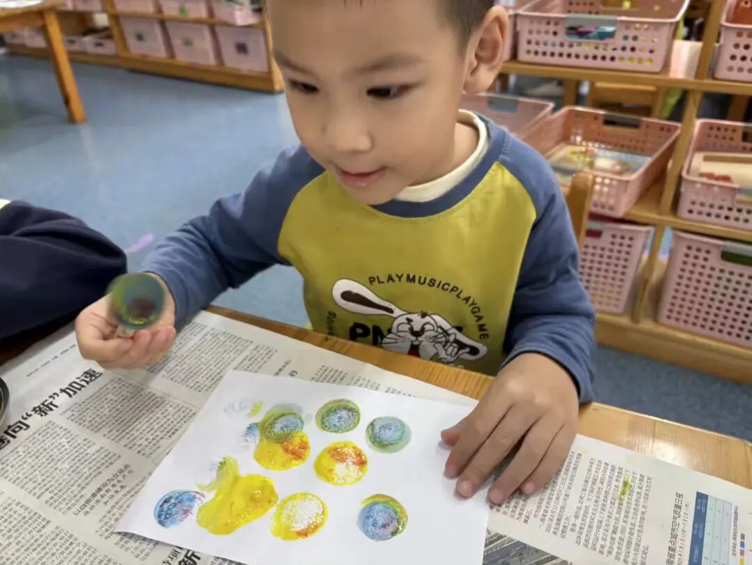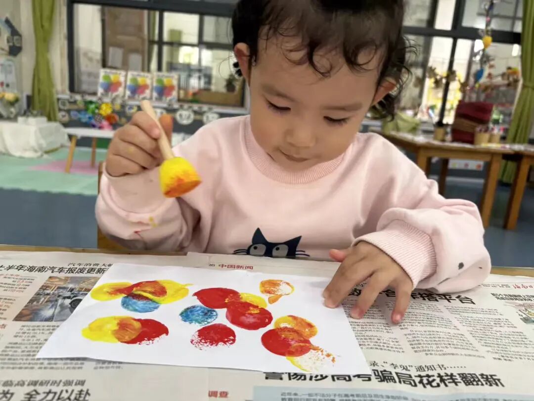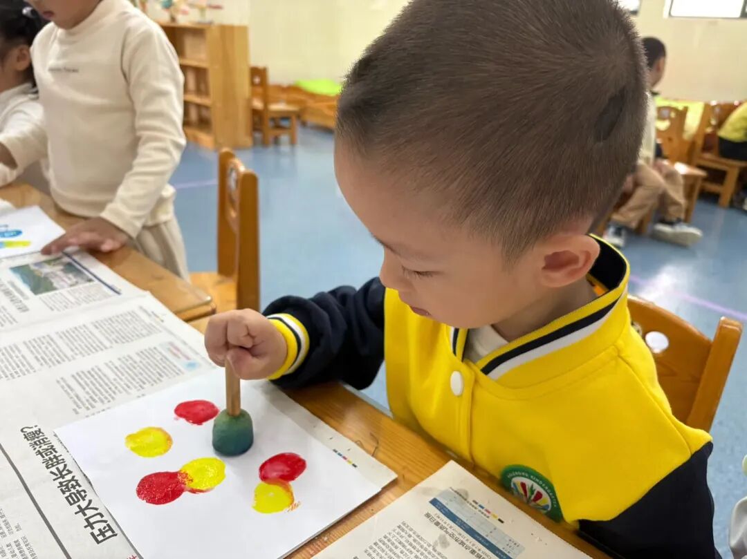 孩子们化身小小艺术家,亲手操作画笔和颜料,开启三原色的奇妙发现之旅。有的小朋友专注地蘸取红黄蓝颜料在纸上拓印,有的认真观察色彩叠加后变出的新颜色,一张张画纸上晕开了五彩的圆点。在动手实践中,孩子们直观感受着三原色混合的魔法,在趣味创作里解锁色彩的奥秘,满眼都是对色彩世界的好奇与惊喜。