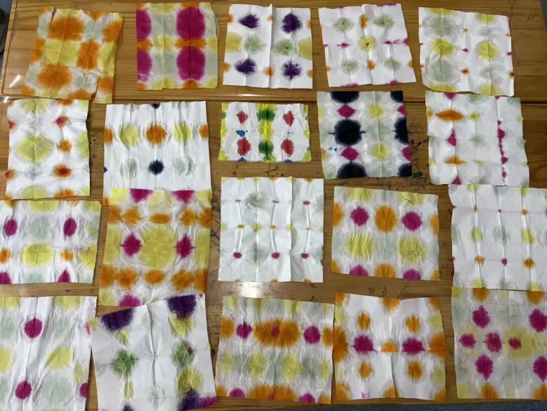 扎染活动课上,孩子们全情投入创作。小男孩专注地折叠、摆弄纸张,指尖细致操作扎染材料;小女孩认真观察流程,眼神满是探索欲。孩子们在动手实践中感知扎染的色彩与工艺魅力,专注力和动手能力都得到了很好的锻炼。