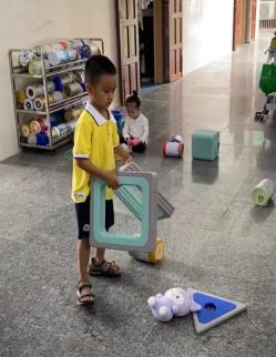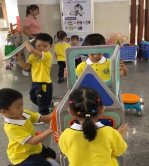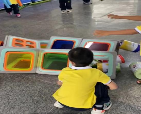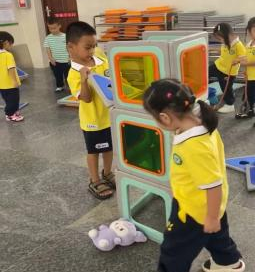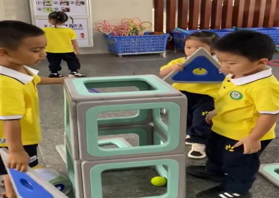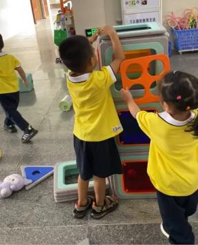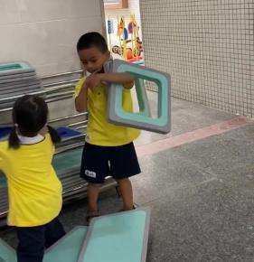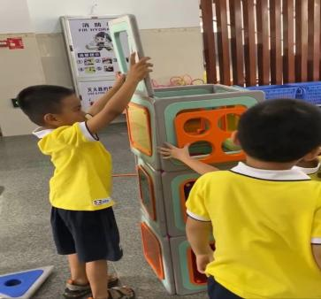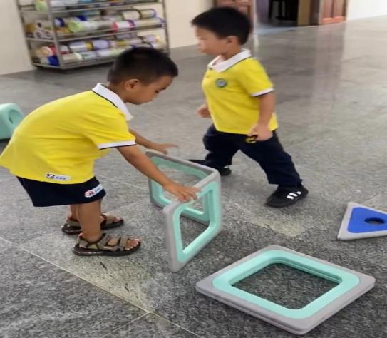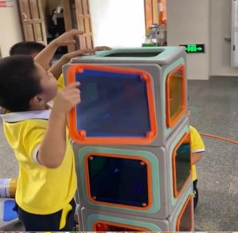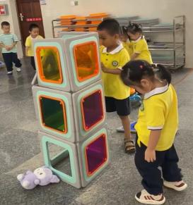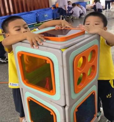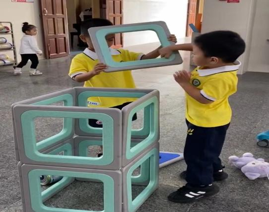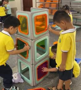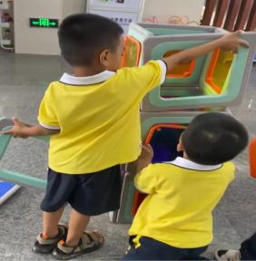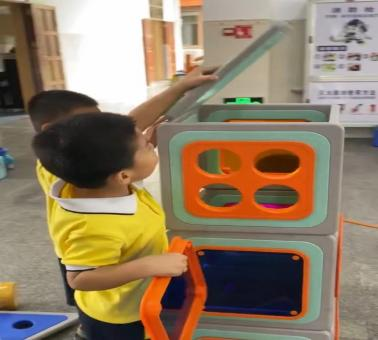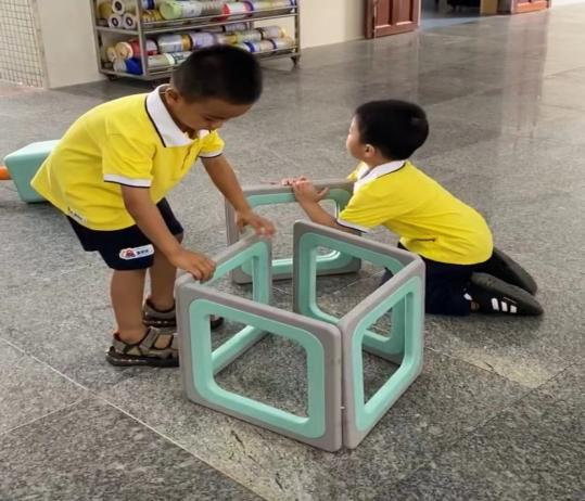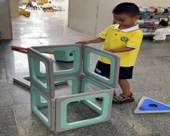 游戏的起因:小二班本月的游戏区域更换到了大厅2,游戏前,老师通过观看图片和现场直观的方式让孩子们了解了大厅2所投放的游戏材料,那里有一套完整的大型磁力思维积木,这是一种由各种图形、彩色透明PVC塑料片以及有着各式孔洞的不规则磁板等部件组成的积木玩具,有灰色边框的图形板都带有磁性,放在一起可以互吸,这对于初上幼儿园又没有接触过此类大型磁力积木的小班幼儿来说既新鲜又好奇,孩子们对于这种新型的搭建材料十分感兴趣,尤其是小男生-陈朝旭小朋友,新材料成功唤起了他强烈好奇心与专注力,开启了一场关于磁力与空间的奇妙探索之旅。
