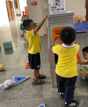 文璟又把手上的红色透明PVC塑料片想封住了镂空部分,朝旭也踮起脚一起把红色透明PVC塑料片放在了顶上的镂空部分,并一起用手拍一拍,直到塑料片全嵌入,他转身又去拿了几块镂空的正方形磁力板,尝试继续往上垒高,板没有立起来,还是“啪”的一声平铺吸在了上面,最后他选择把手上的板分几次都平铺在了上面,又去各玩具筐前寻找材料。