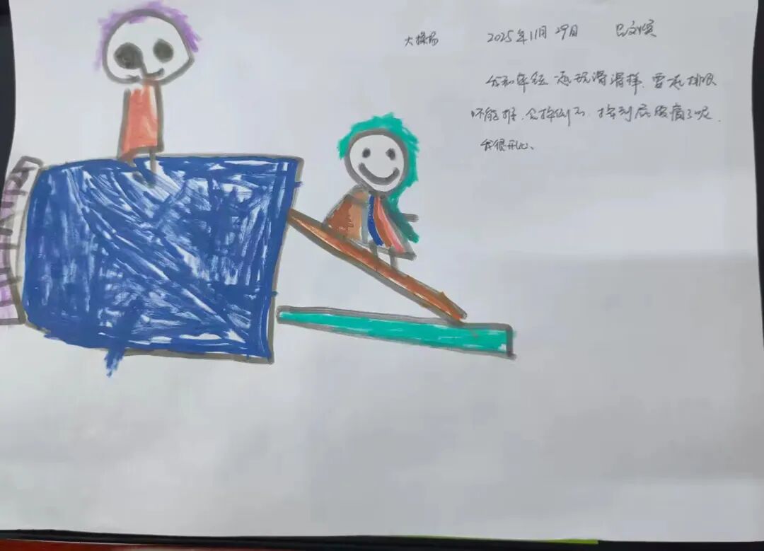 游戏过程:游戏开始,林萍钰与吕文焕自主从大操场材料区选取木板和木质架子,开启滑滑梯搭建。林萍钰先尝试将木板搭在架子上,因角度过陡导致木板滑落,吕文焕立刻上前扶住架子,说:“你把架子往后面拉一点咯,要倒了”,两人反复调整木板倾斜度并反复试木板的稳固性,最终固定成简单滑滑梯。在滑行的过程中,龚晓翡看到滑滑梯,也加入到了他们的游戏中。林萍钰先提出“排队玩才不会挤”,三人便自发形成排队规则,轮流滑行时还会提醒对方“手抓好”,“要小心哦”“开心不?”三人在滑行后脸上漏出开心的笑容,有拍手,蹦跳,等肢体动作,表示开心,三位幼儿以简短口语完成沟通,展现出初步的合作与规则意识。