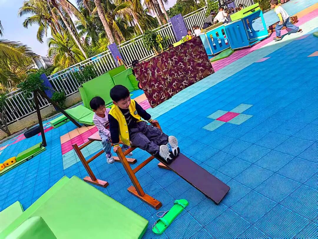 游戏过程:第二次游戏时,龚晓翡看到第一次简单版滑滑梯后,主动和韩阳定说“我们搭更高的滑滑梯吧”,随即自己推来安吉箱作为滑梯底座。陈艾琳观察到安吉箱垫高后滑滑梯高度增加,立刻跑去材料区搬来绿色地垫,平铺在滑梯下方作为缓冲。韩阳定就负责搬运木梯和木板,三人分工明确。龚晓翡负责拼接安吉箱与木梯的衔接处,韩阳定固定木板与木梯的连接点,陈艾琳反复尝试调整地垫位置,确保覆盖滑梯落点。经过多次的尝试合作,搭建完成后,三人轮流滑行,龚晓翡滑行前拍一拍地垫确认“地垫很大”“不会受伤”,陈艾琳则在旁提醒“你慢慢滑,我保护你”,三人在滑行后,韩阳定在地垫上开心的翻滚,艾琳站起来后蹦蹦跳跳的重新排队。安全意识与协作的默契度显著提升。