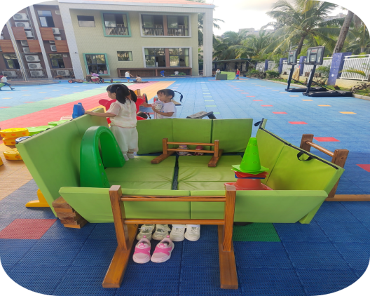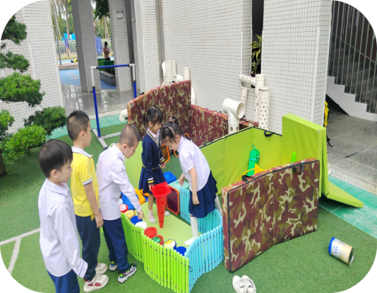 游戏材料投放:投放有垫子、木架、拱门、平衡步道、纸盘、雪花片等多元材料;游戏源于幼儿在大操场活动时,自发利用现有场地与材料模仿“制作奶茶”,并逐步延伸至多个区域形成跨场景进阶游戏;前期幼儿已具备一定角色游戏经验,合作意识萌芽,且有强烈的自主探索欲望,能够结合生活经验发起游戏并实现跨场景延伸。