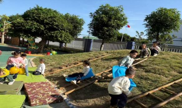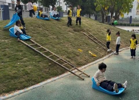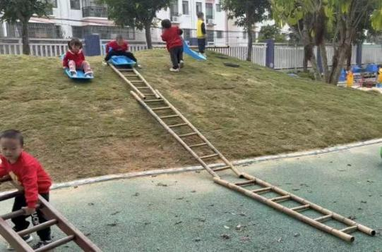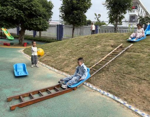 教师反思:依据《3-6岁儿童学习与发展指南》中说到,3-4岁幼儿正处于具体形象思维阶段,依赖直接感知与实际操作获取经验,在这次的《滑坡游乐场》游戏中,尝试与探索正是孩子们学习的核心方式。从最初单纯使用雪橇板滑行,到尝试用竹梯搭建基础滑道,再到逐步升级为两把、三把梯子拼接的延长滑道,孩子们在自主探索中不断拓展游戏玩法,展现出清晰的能力成长轨迹。