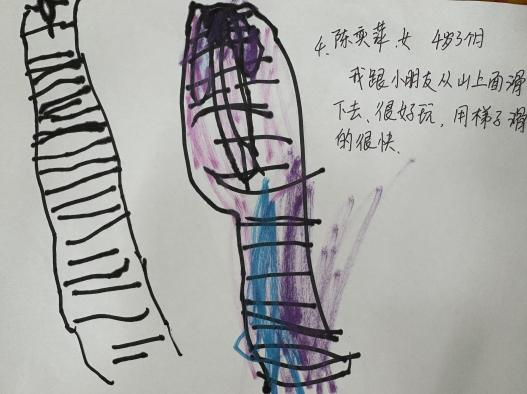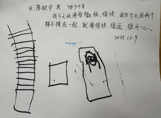 观察四:爬坡滑道再次升级,孩子们搭建的滑道愈发绵长,今天更是用上了三把梯子来拓展滑道。当孩子们稳稳坐上雪橇板,顺着长长的索道滑行而下时,一张张小脸上都洋溢着灿烂的笑容,嘴里还不停欢呼着:“好玩!”“真好玩!”奕萍小朋友还说到,“我们在玩过山车。”宪彬小朋友也兴致勃勃地从山坡上滑了下来,可雪橇板却偏离了预定的滑道,滑向了一旁。不甘心的他反复尝试了好几次,却始终没能成功。就在他快要放弃的瞬间,目光忽然落到了旁边的木梯子上。他看到几位小朋又搬来木梯子,又重新搭建了一条滑道,木梯两旁还放垫子做了保护。宪彬也迫不及待地抱起雪橇板跑上斜坡,这一次,雪橇板稳稳地顺着新搭建的滑道滑了下来。感受着滑行的快乐,他的眼睛眯成了一条弯弯的缝,脸上满是成功的满足与喜悦。