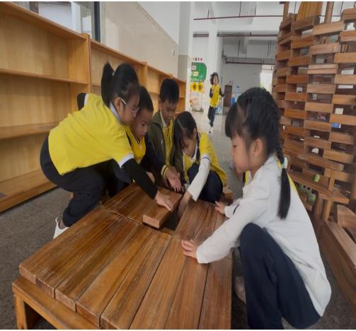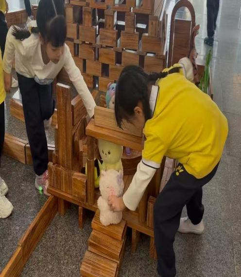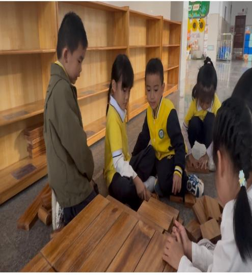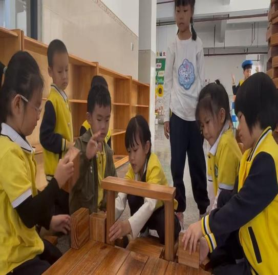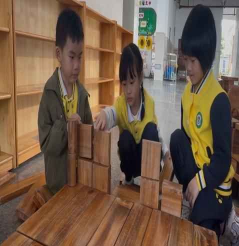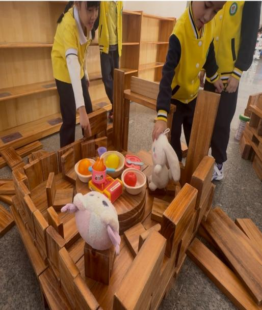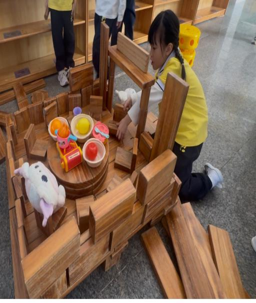 游戏背景:本次观察的游戏区域为幼儿园大厅积木区,该区域投放了长短规格不一的木质积木及辅助材料,能够满足幼儿搭建不同建筑结构的操作需求。