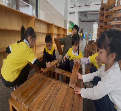 欧芯玥、王梦莎注意到旁边在玩煮饭游戏的许家杰和张屹北小朋友,于是主动邀请他们加入餐厅游戏,许家杰、张屹北果断答应。许家杰将他们玩的食材和电磁炉玩具搬到餐厅中,过程中他们发现“只有餐桌,还少了座位”,几位小朋友又主动去寻找薄片小方块积木摆放座位。