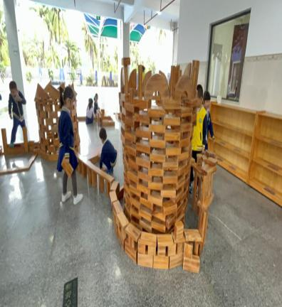 梦莎拉着谷粒在积木柜前看了看,就转过身去对着文昭说:“现在剩的积木有点少了,我们只能拿这些去搭建了。”文昭说:“没关系,老师说了,没有积木我们还可以用别的材料来搭建,所有材料我们都是可以用的。”接着大家就去拿材料,梦莎和文昭先拿来了粗的短方块积木和长条积木组合着搭建了底层,谷粒和航齐又搬来了奶瓶罐,梦莎说:“要放一样高的奶瓶罐才不会倒。”谷粒说:“这几个都是一样高的。”接着他们又把长条积木继续往上垒搭,谷粒和文昭看到高楼越来越高了,他们就去搬来两个小凳子,又站到凳子上继续往上创作。航齐说:“我来帮你们拿材料吧。”他搬来了圆形的磁吸游戏材料和三角形积木做了封顶装饰。