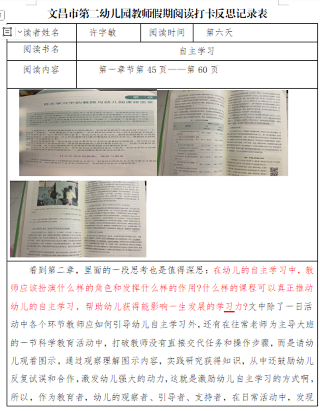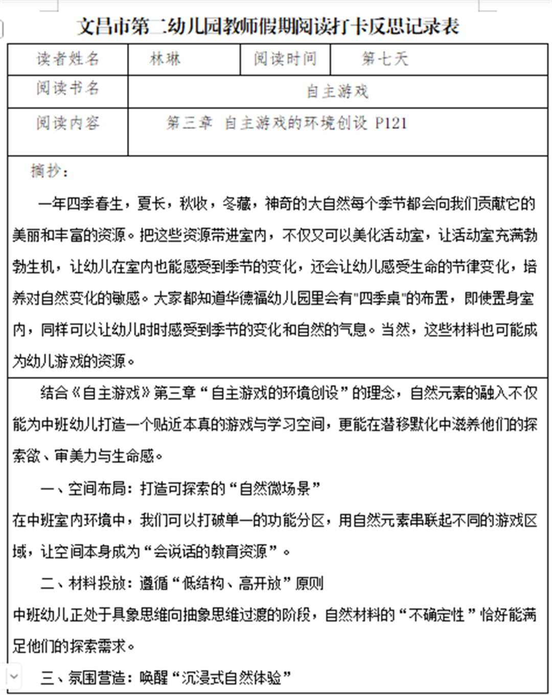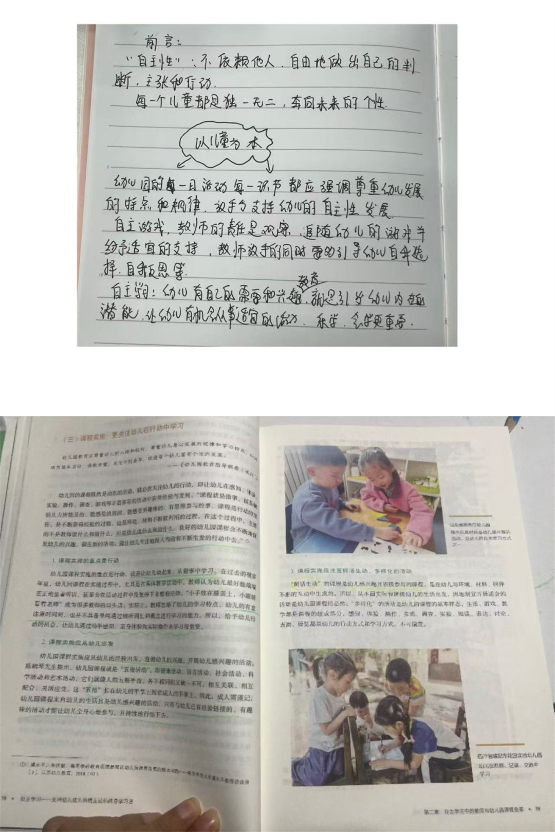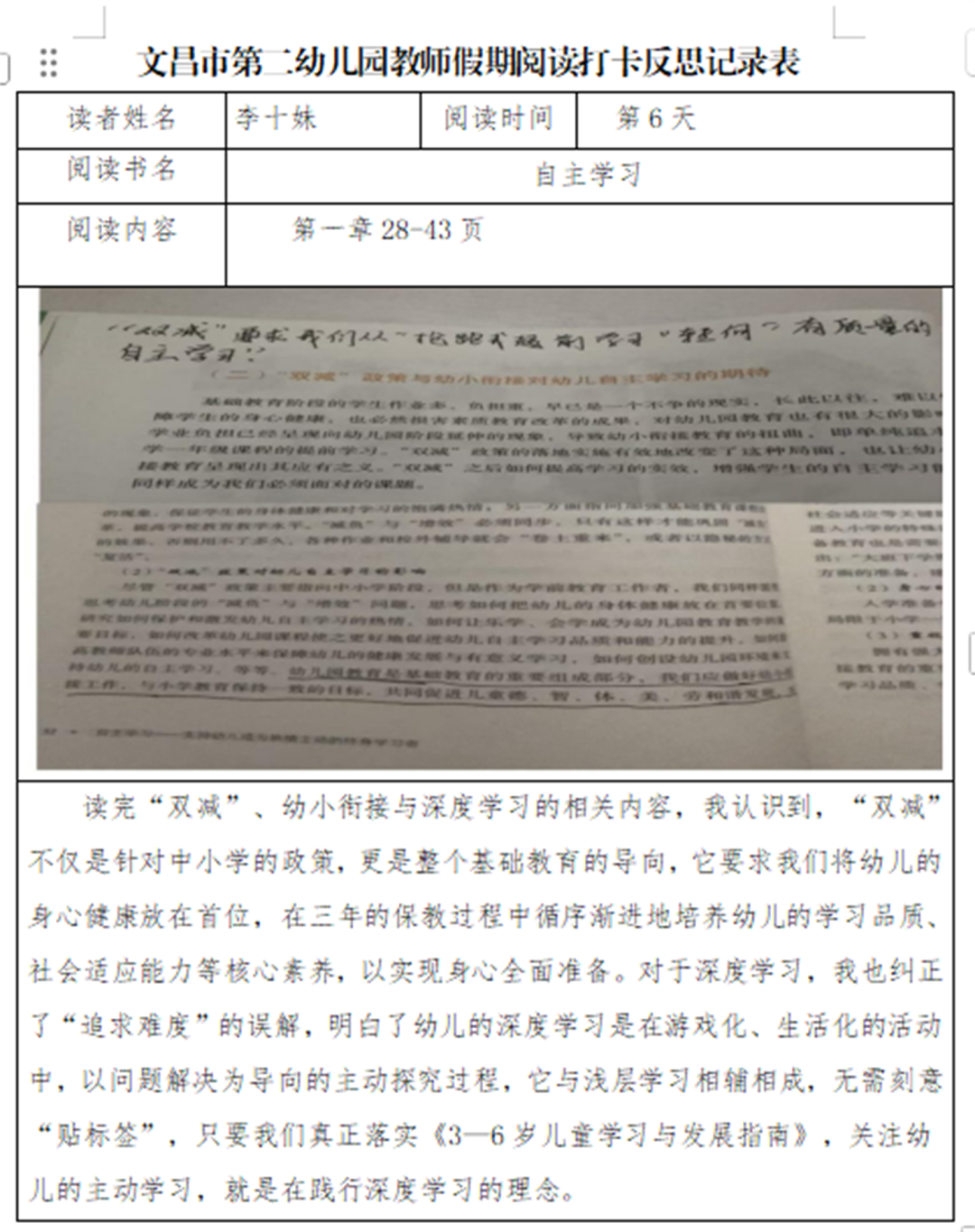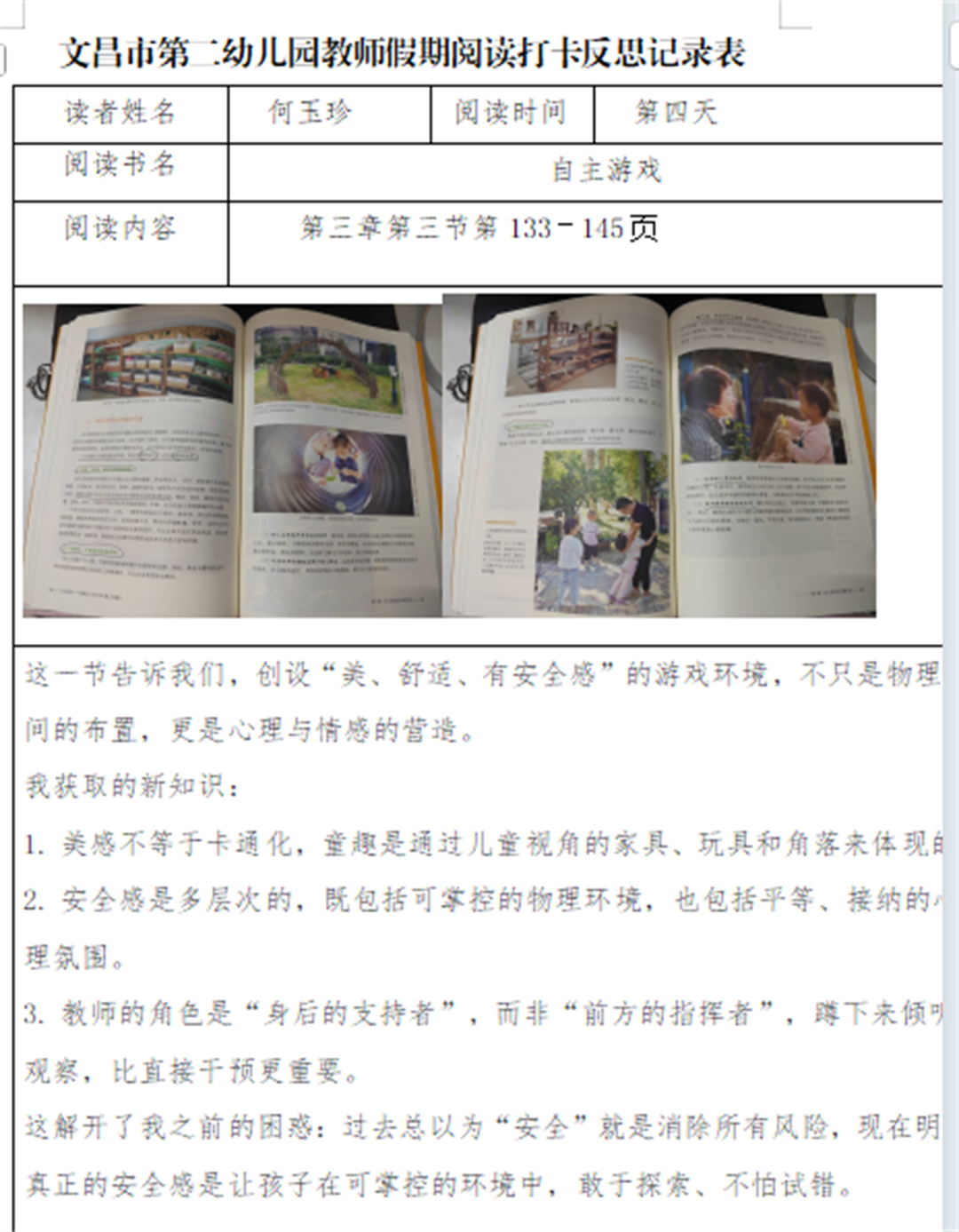黄菲菲:阅读这两章节后,我的教育认知被彻底重塑。我深刻领悟到,学习的本质是幼儿在生活、游戏、交往中的主动探索,而非被动听讲,自主学习是“行动—反思—对话—迁移”的完整生态,深度学习则源于幼儿内在兴趣与教师的“放手”支持。幼儿园课程不是预设的教本,而是鲜活的生态系统,应跟随幼儿好奇生长。未来教育四大支柱提醒我,小班教育需融入“学会求知、做事、共处、做人”目标。我将从“灌输者”转变为幼儿学习的守护者、支持者,学会慢下来耐心观察引导,记录幼儿自主学习表现,衔接家园传递科学理念,助力孩子成长为完整个体。
