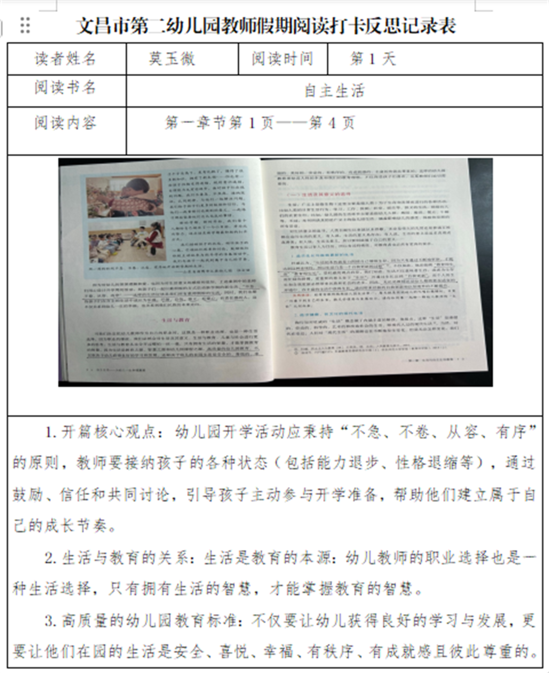 林文贞:假期研读《自主生活》的前两章,我对大班幼儿自主能力培养有了全新的认知。书中强调,自主不是放任,而是为幼儿创设“能做主”的环境,给予他们尝试、探索甚至犯错的机会,这与《3-6岁儿童学习与发展指南》中“尊重幼儿的个体差异和自主选择”的理念高度契合。联想到大班幼儿的日常,自我服务、游戏决策等环节,往往是我们过度干预,剥夺了他们锻炼自主意识的契机。比如游戏后整理玩具时急于代劳,游戏前直接规划玩法,反而让孩子失去了独立思考和解决问题的空间。作为大班教师,我们应转变角色,从“主导者”变为“支持者”。今后我会在班级中多设置自主任务,如让幼儿自主制定值日表、选择游戏材料,在点滴中培养他们的责任意识和自主能力,为幼小衔接筑牢基础。